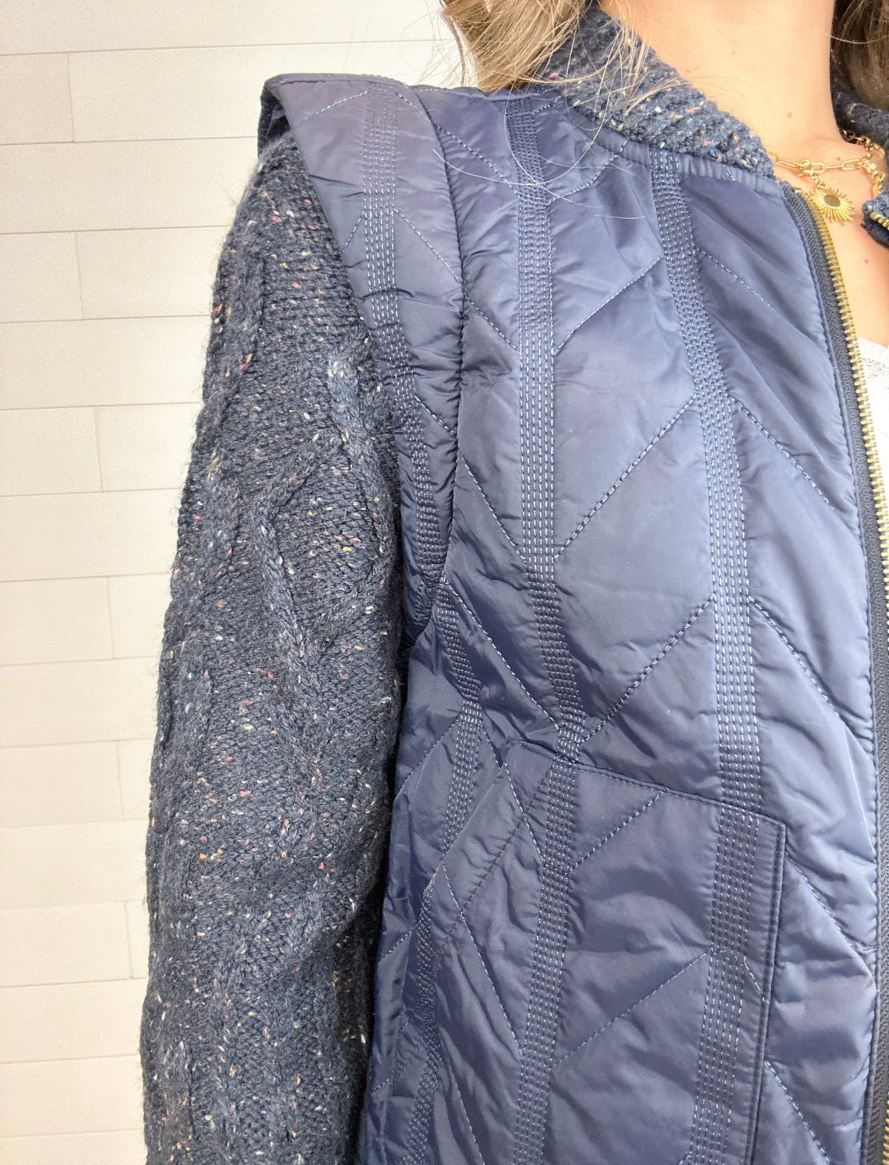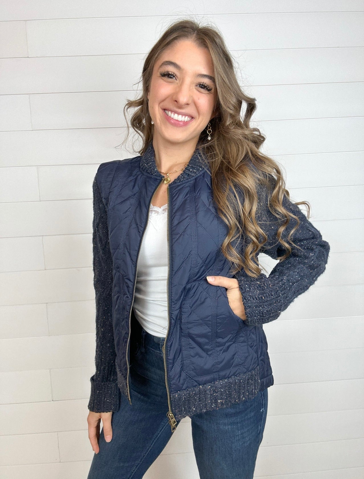 Ribbed knit detailing at the collar, cuffs, and hemline