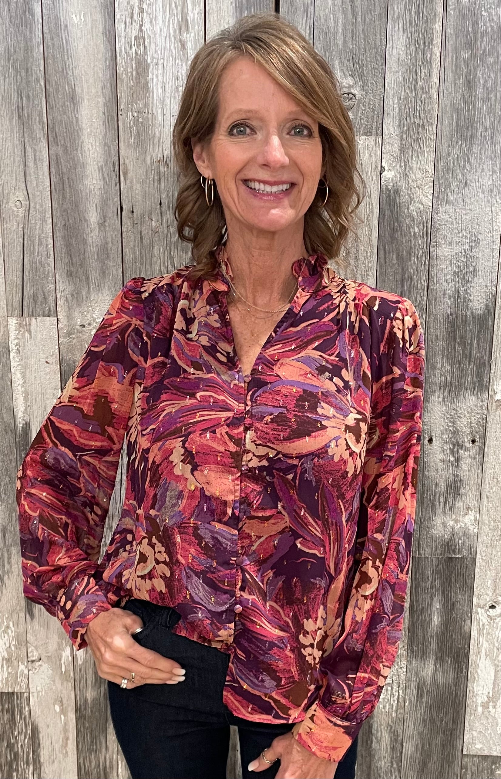 Abstract Print w/ Lurex Chiffon Ruffle Neck Blouse