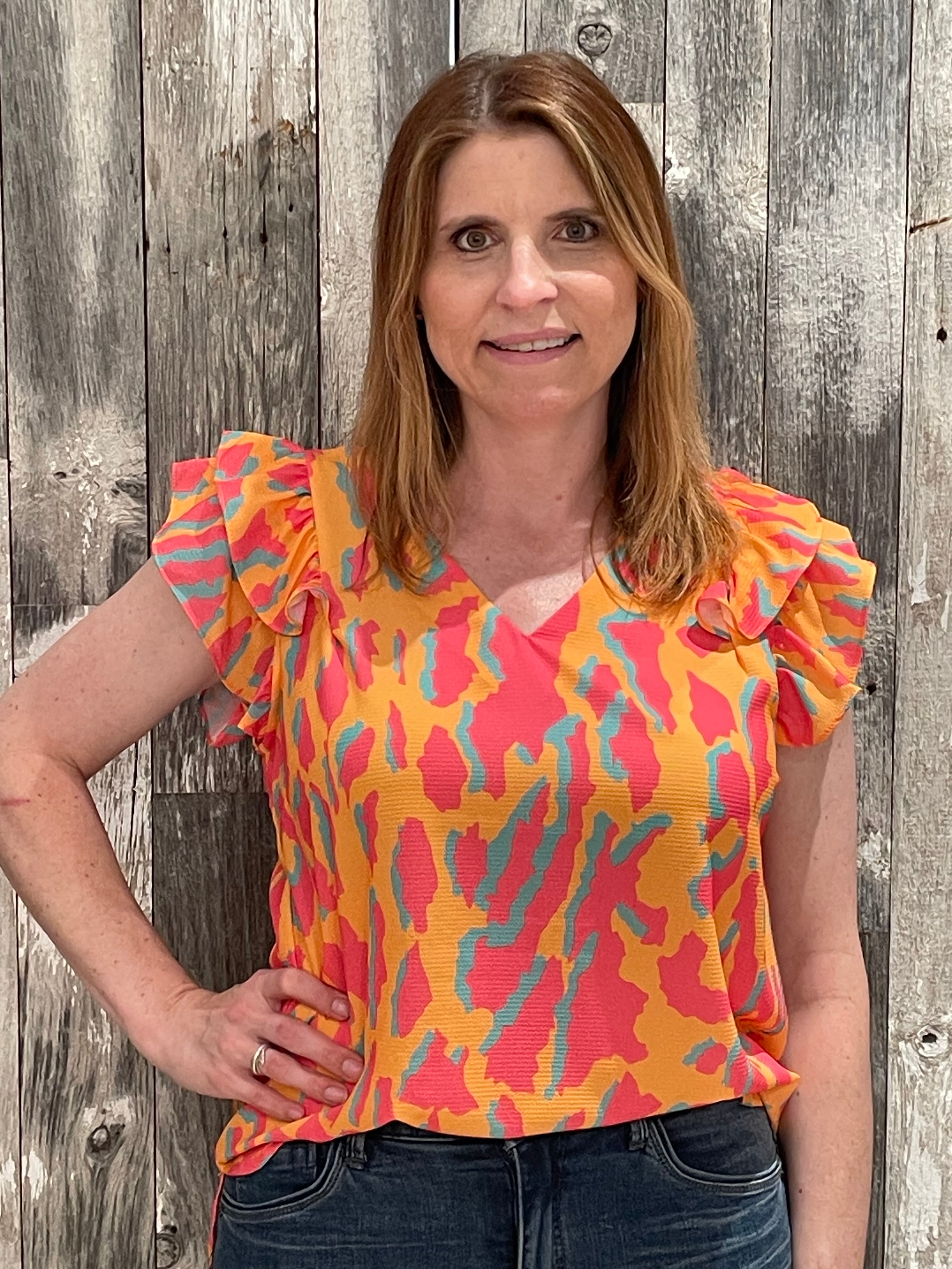 The Abstract V-Neck Blouse w/Double Ruffle Sleeve is an instant mood-lifter with its playful cheetah-inspired print in pink and green on a juicy mango-orange backdrop. The double flutter sleeves add movement and charm, while the flattering V-neckline makes it an easy pick for work or weekend.