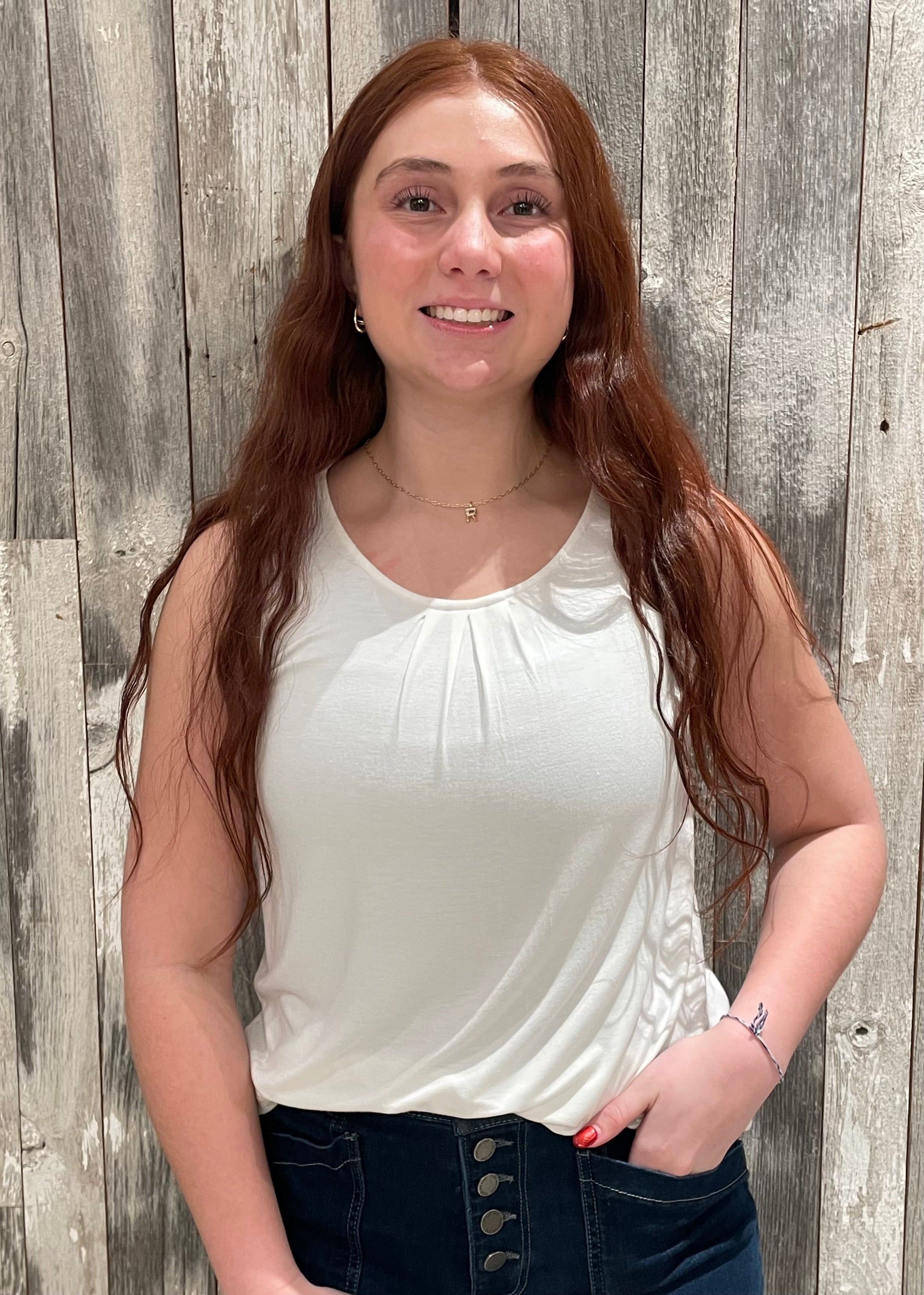 This bamboo tank top combines eco-friendly materials with effortless style and comfort. Designed with a relaxed fit, it features a scoop neckline and delicate pleating at the front for a flattering and feminine touch. The ultra-soft bamboo fabric offers breathability and a lightweight feel, making it perfect for layering or wearing on its own. Ideal for pairing with jeans, shorts, or skirts, this versatile tank is a sustainable staple for any wardrobe