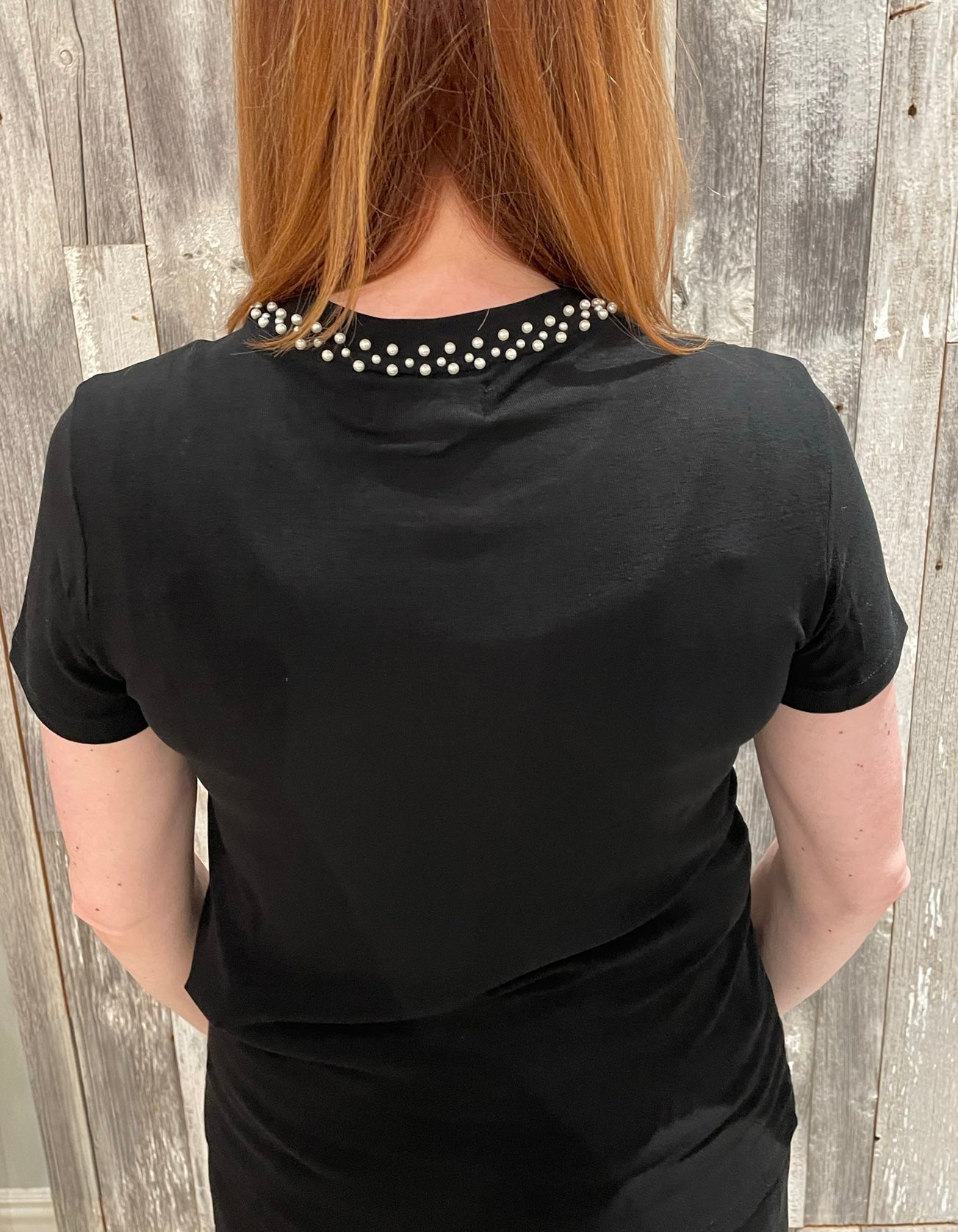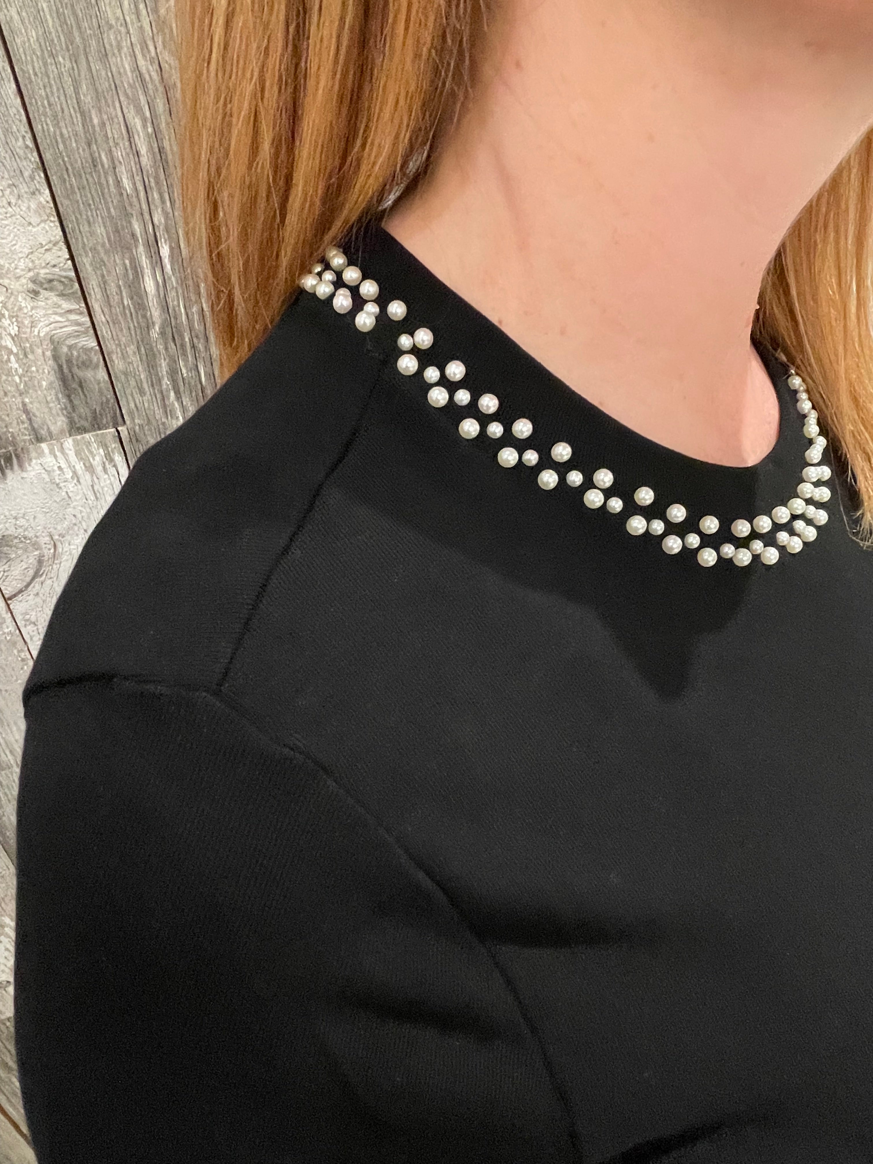 Neckline: Round crew neck with embellished beaded detail (adds a subtle statement touch)
