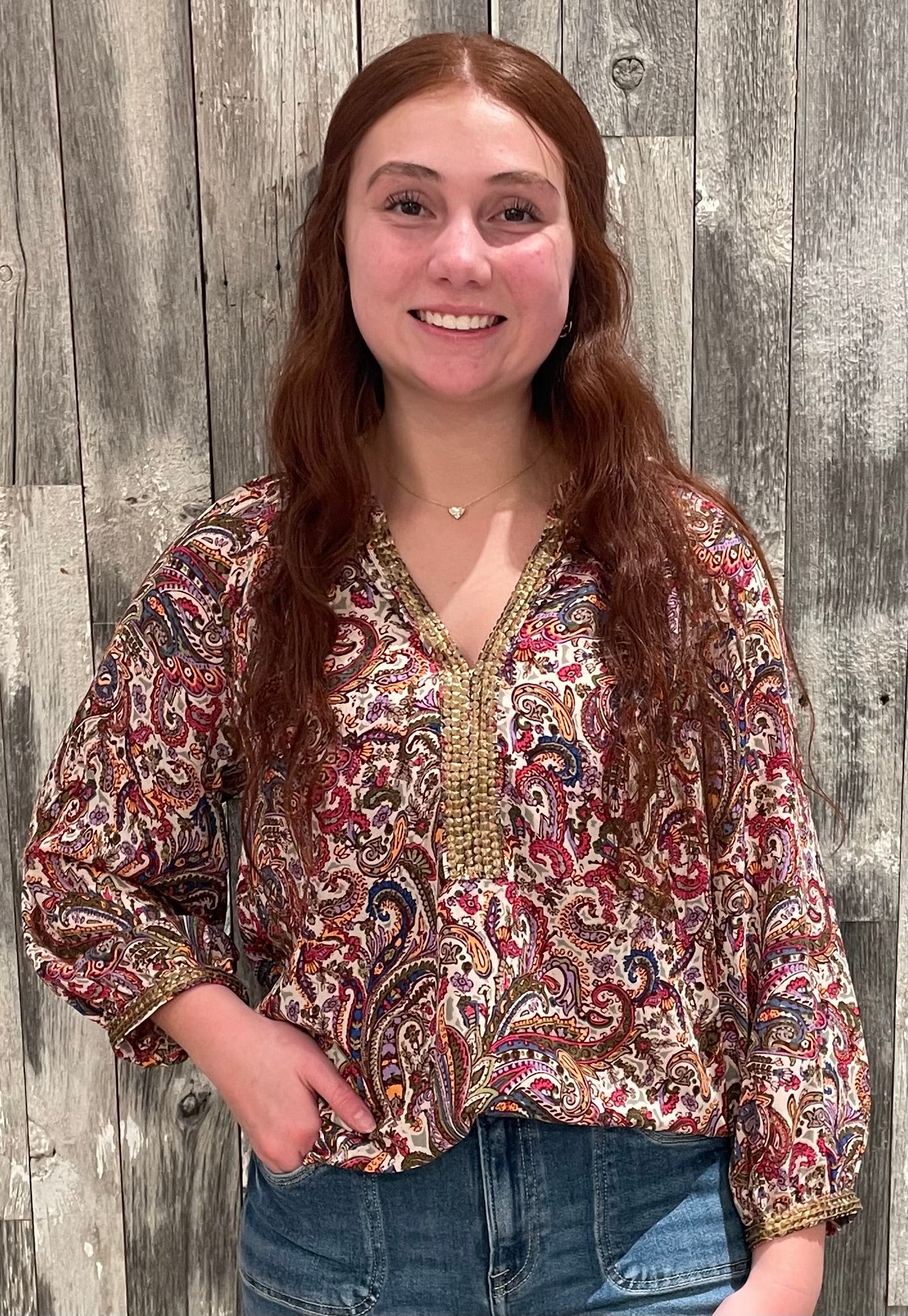The Blouson Sleeve Ruffle Edge Printed Top features a delicate print and feminine ruffle edges, adding charm to your wardrobe. The blouson sleeves provide a flowy silhouette, perfect for pairing with jeans or skirts for a casual or dressy look.