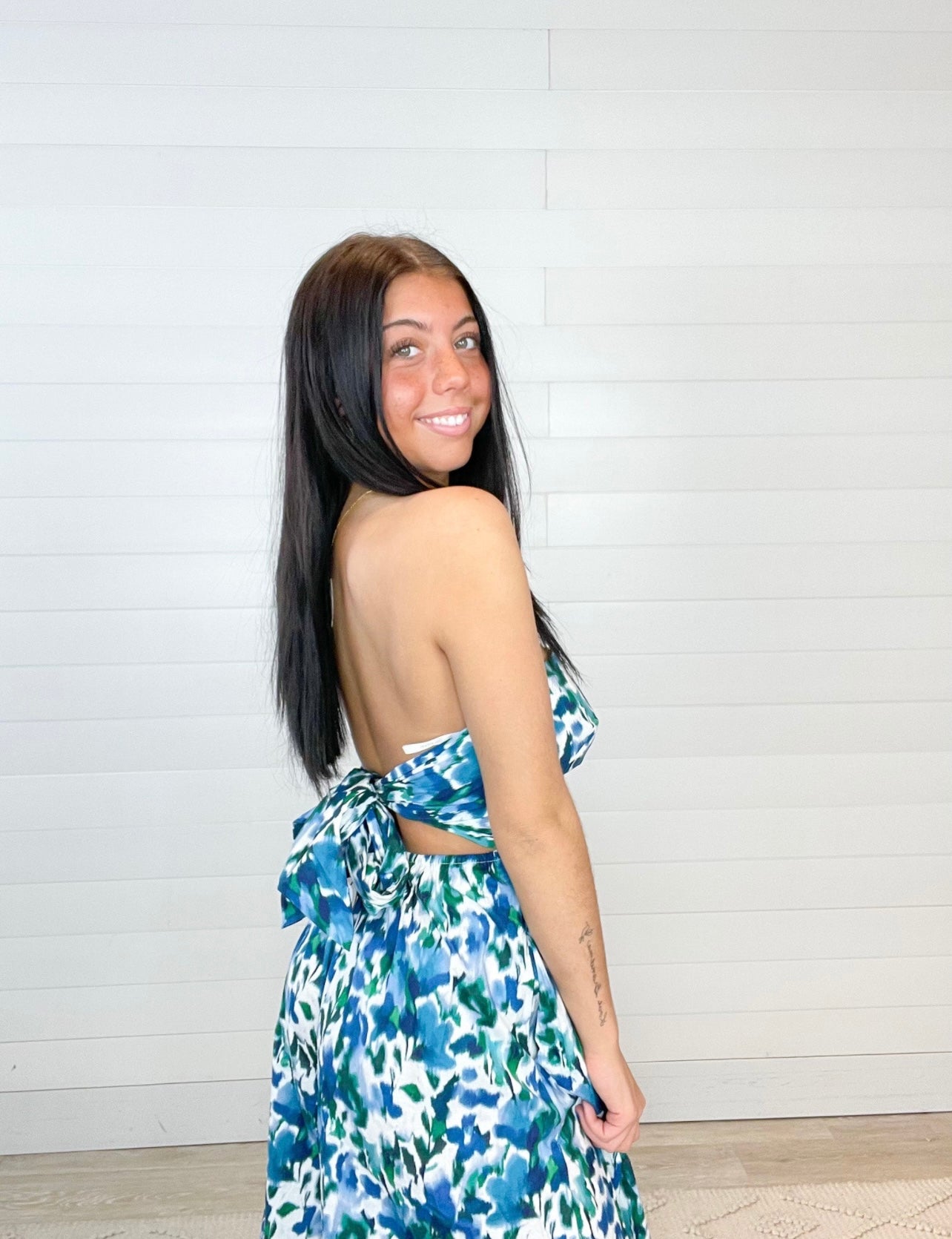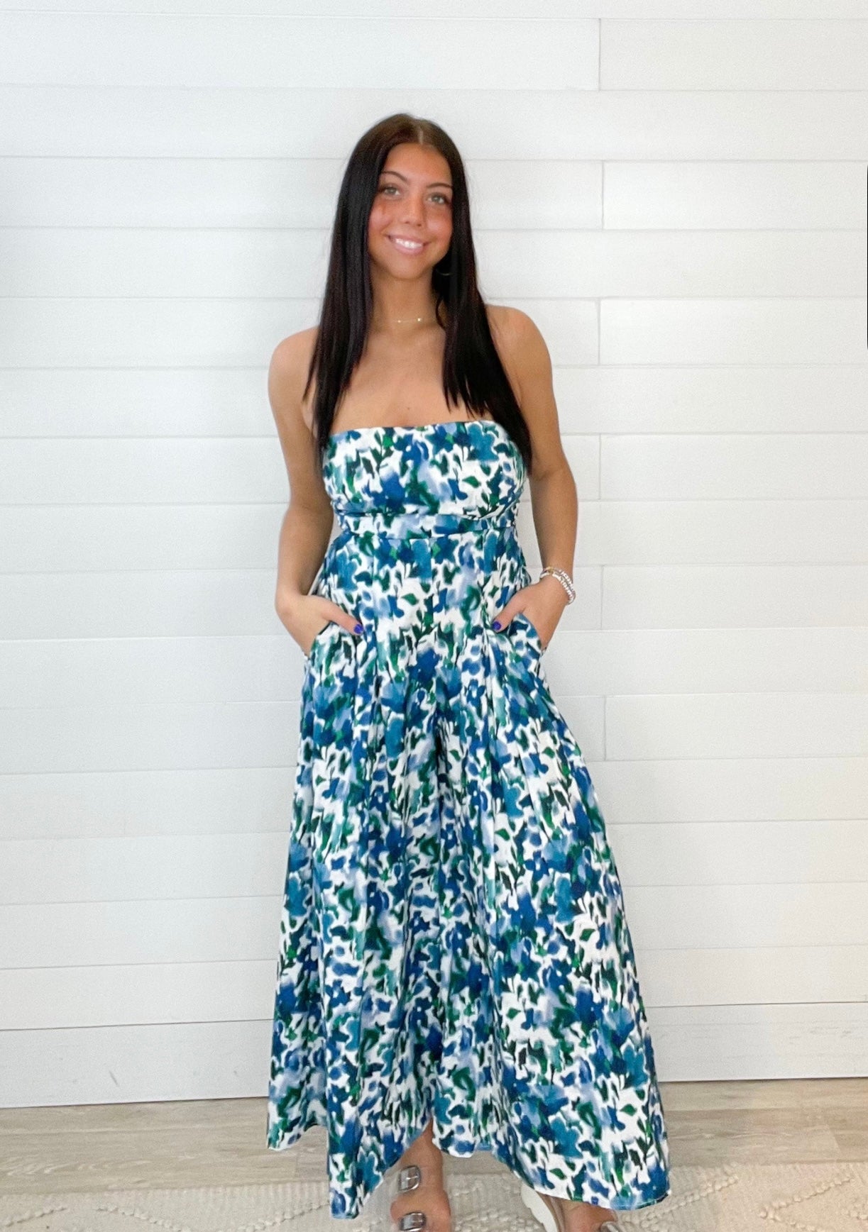 Turn heads in our Blurred Ikat Floral Tie-Back Bandeau Jumpsuit. Featuring a bold, eye-catching print and a flattering bandeau neckline, this jumpsuit is perfect for sunny days and stylish getaways. The open back with a tie detail adds a flirty touch, while the elastic waist ensures a comfortable, flexible fit.