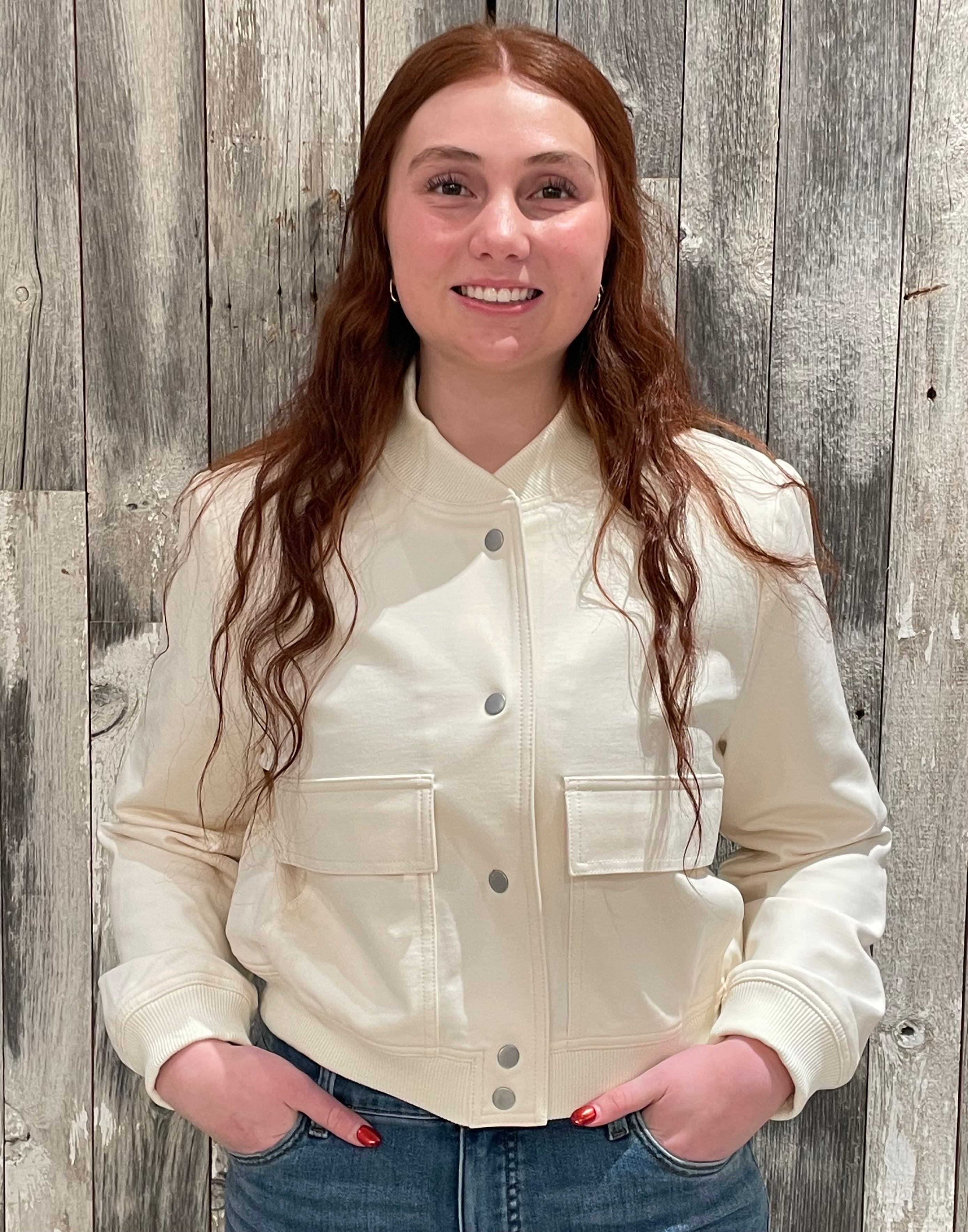 This chic bomber jacket blends classic style with a modern, minimalist design. Featuring a creamy off-white hue, it boasts a structured fit with ribbed cuffs, hem, and collar for a sporty yet sophisticated look. The jacket includes front flap pockets and sleek snap button closures, adding both functionality and flair. Perfect for layering over casual or dressy outfits, this versatile piece is a must-have for a polished and contemporary wardrobe.