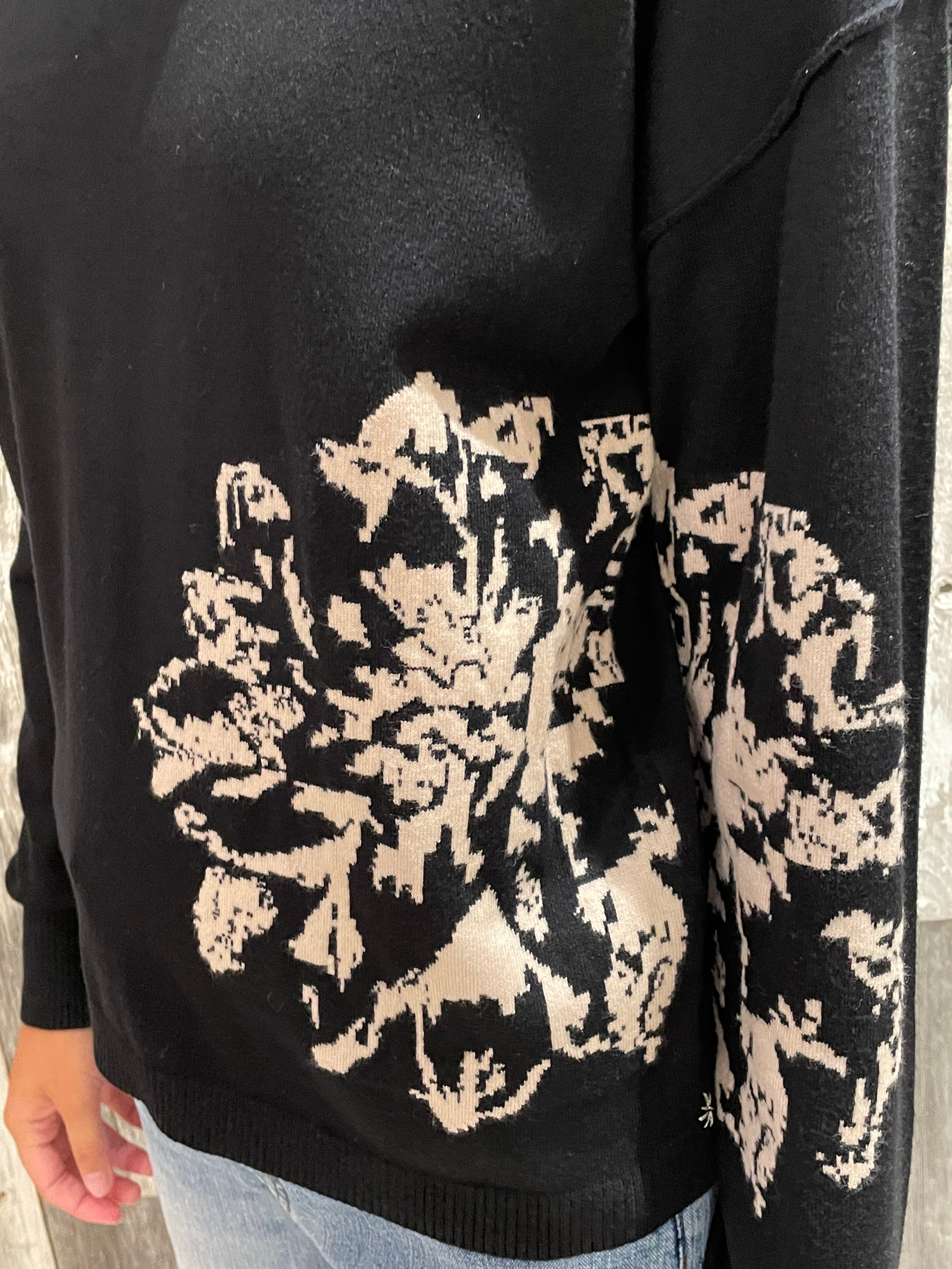 Placement floral intarsia at right hip and along sleeve