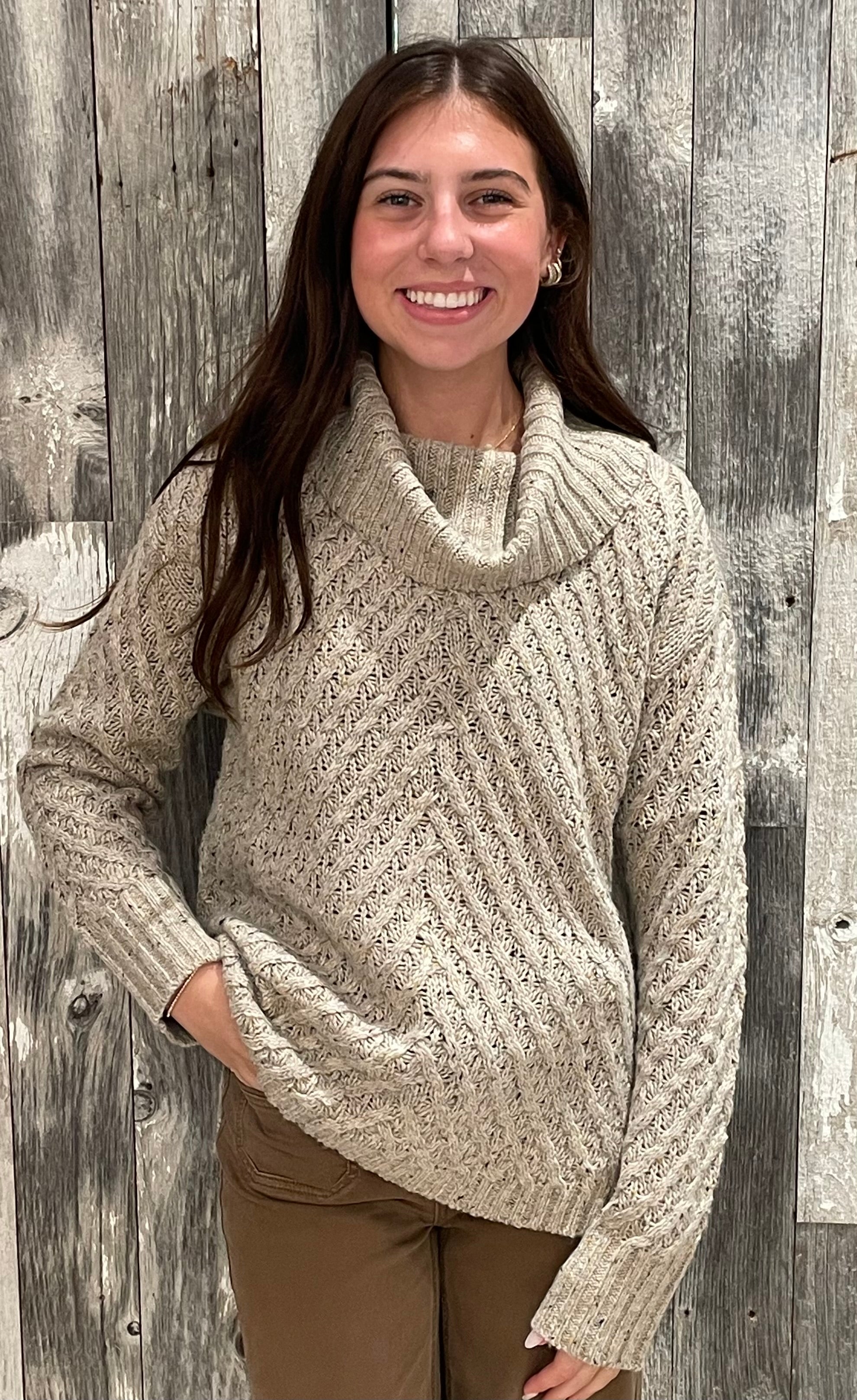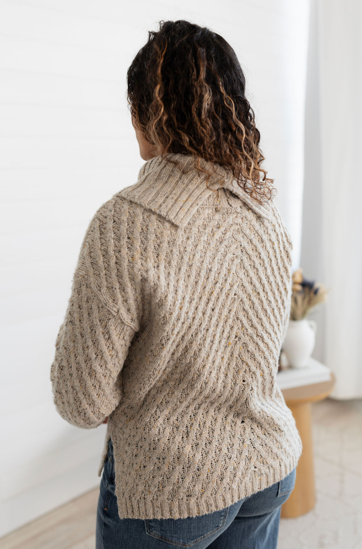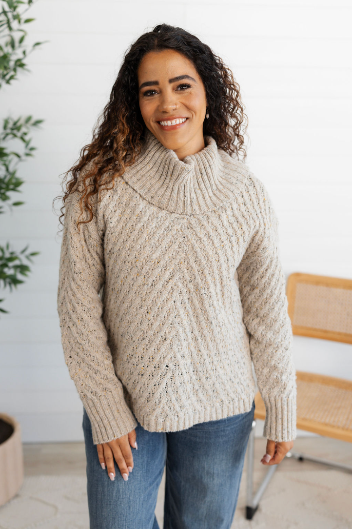 This heathered knit sweater brings unexpected charm with its diagonal cable detailing and subtly flared turtleneck collar—split in the back for easy comfort and a hint of flair. The warm taupe base is flecked with mustard and black for a rich, autumnal palette that feels right at home with jeans or tailored trousers.