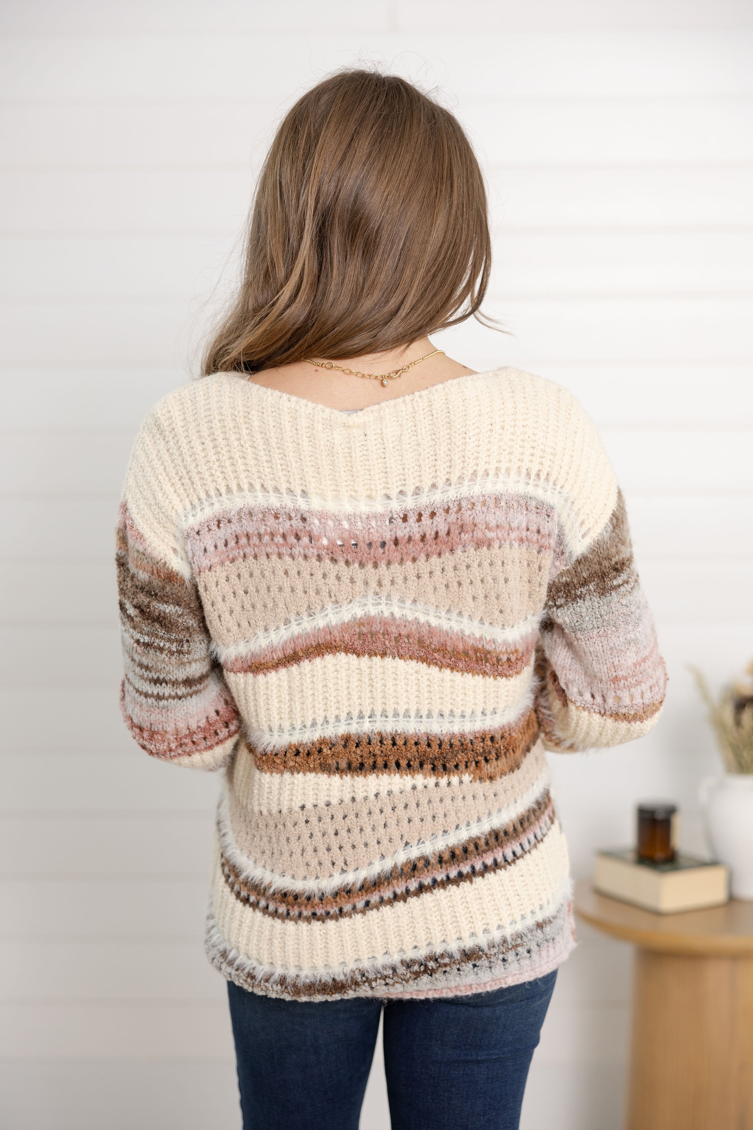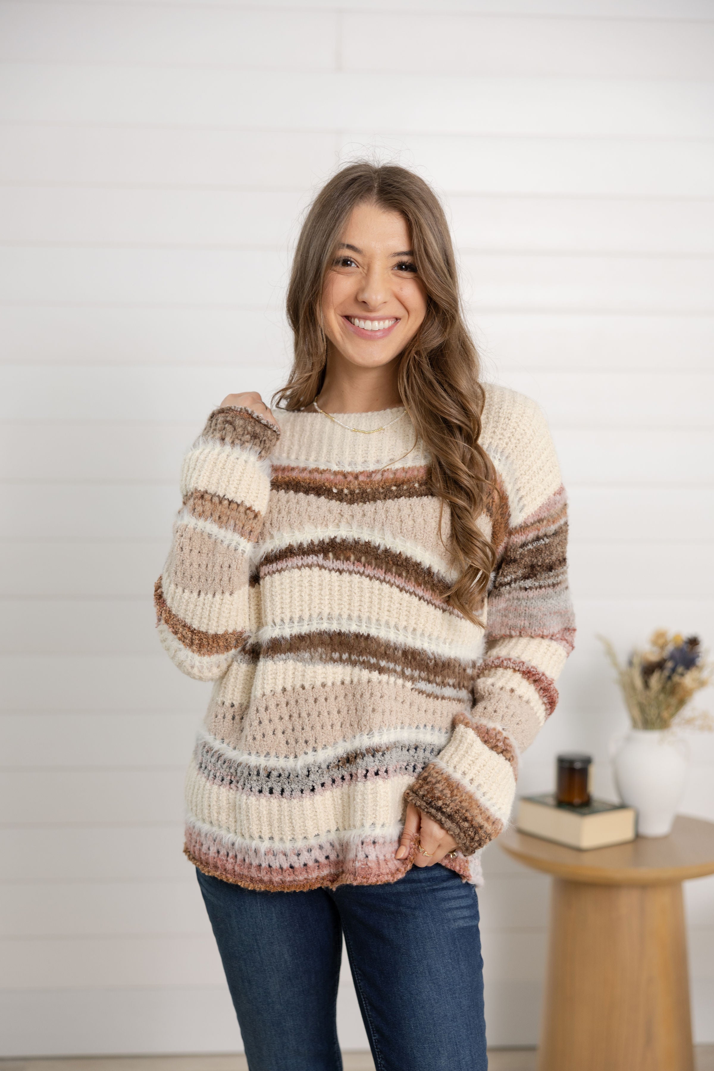 Charlie B’s Mixed Knit Striped Sweater blends cozy comfort with artful design. Each stripe is a unique mix of color and texture—soft, organic, and a little bit playful—woven together in warm neutrals with a subtle pop of mauve. The result is a sweater that feels both timeless and refreshingly modern, perfect for slow mornings, crisp walks, or casual evenings out.