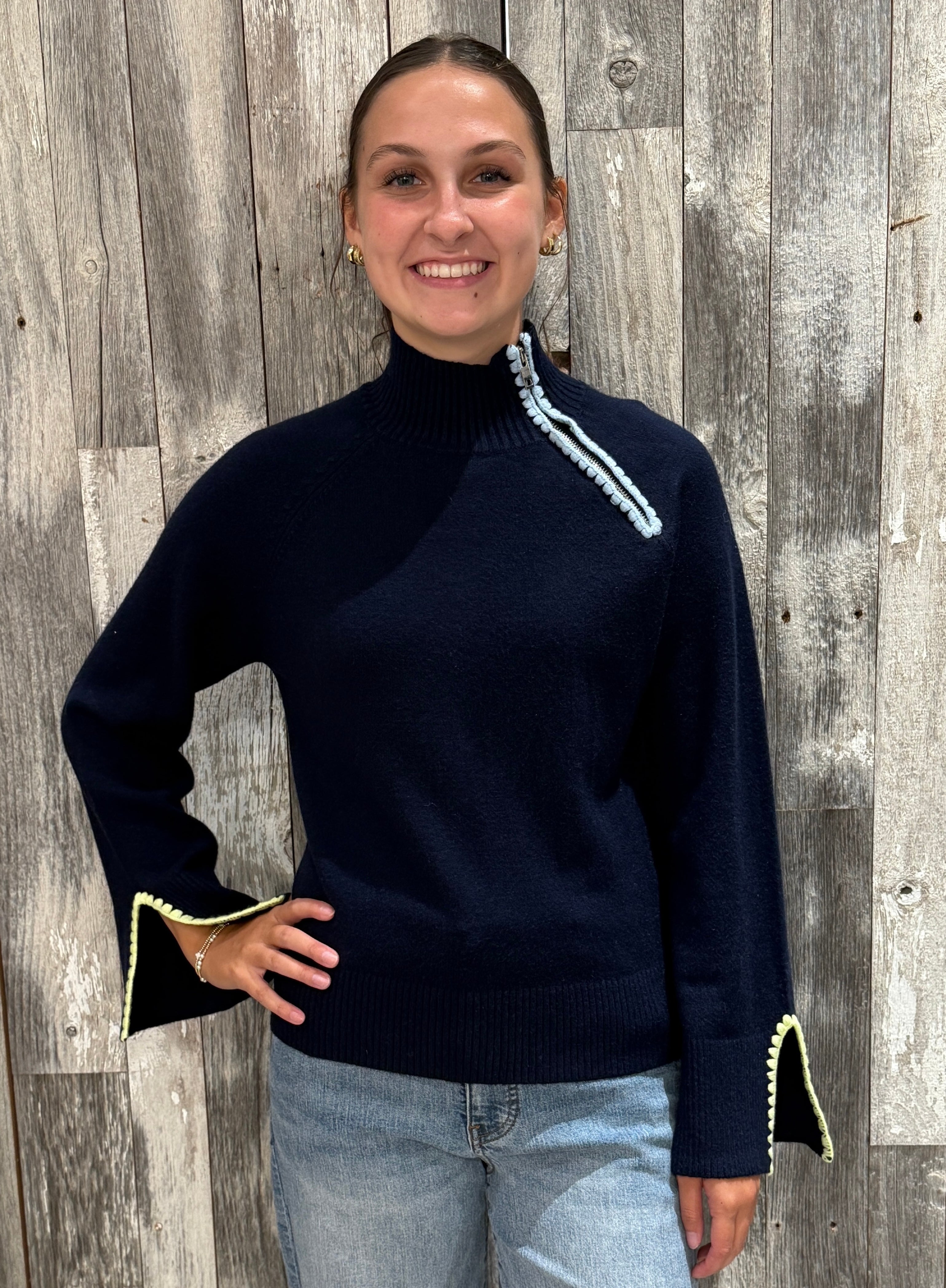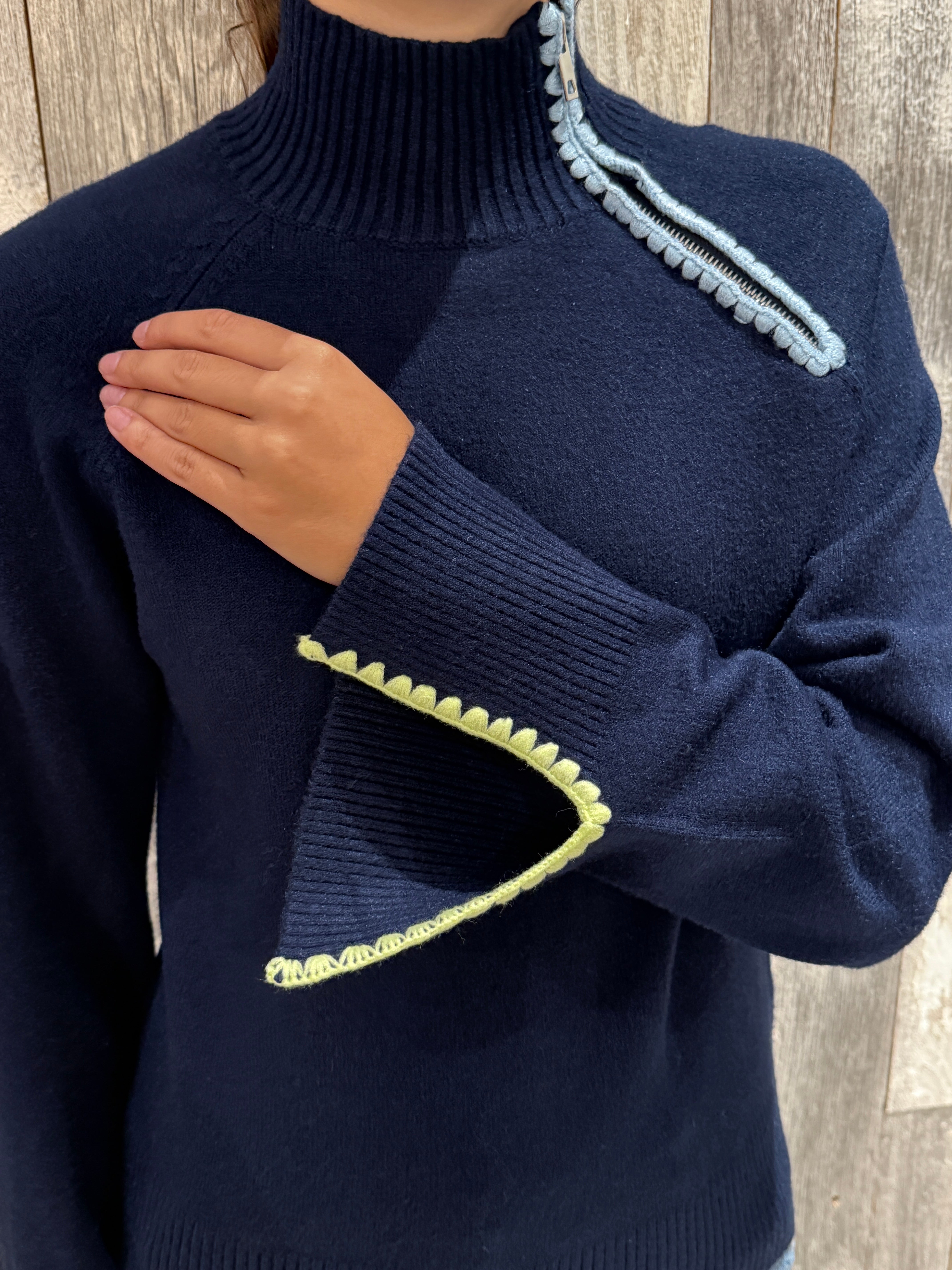 Asymmetric quarter-zip at neckline with contrast scalloped trim