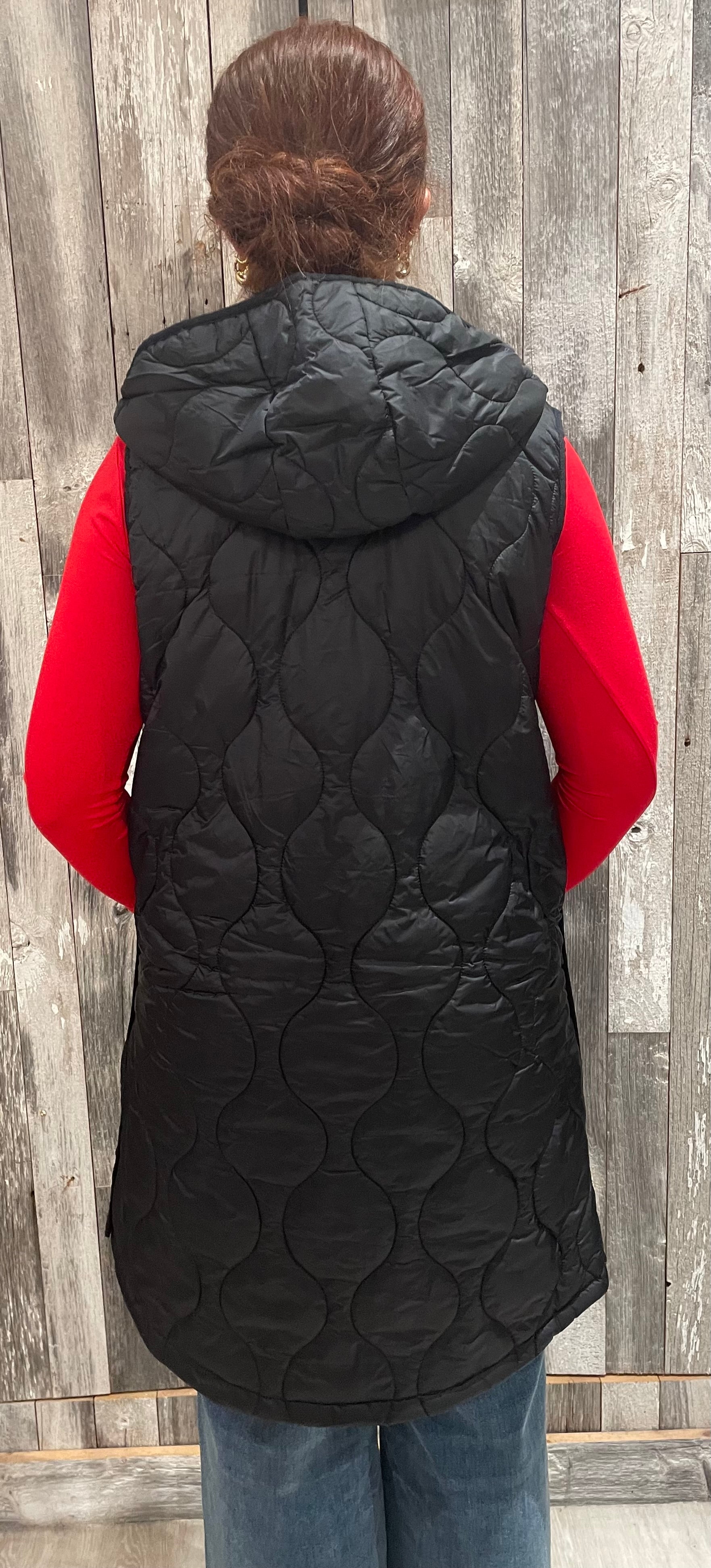 Style: Longline quilted puffer vest with a modern, sleek silhouette.