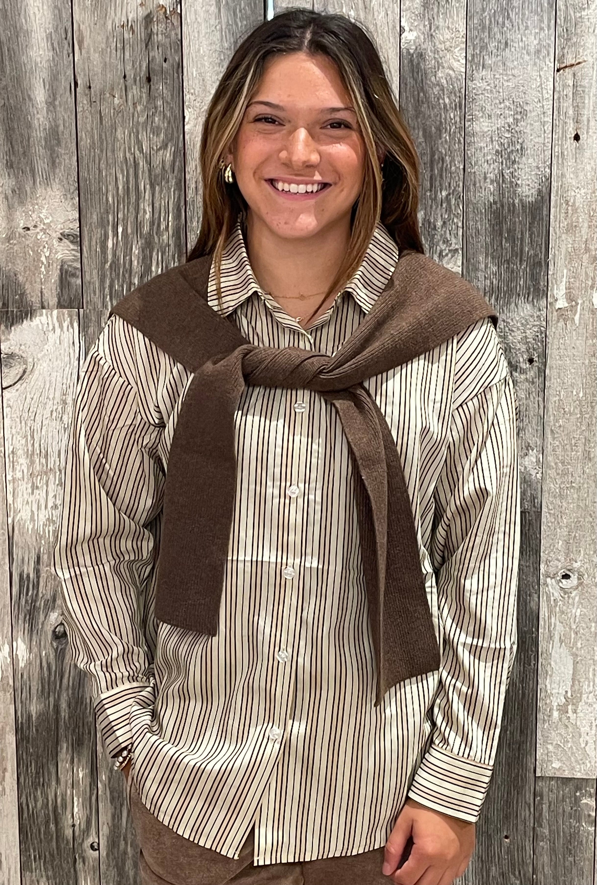 - Design: The Jaci Top features a traditional button-up shirt with a pointed collar and long sleeves, elevated by an over-the-shoulder sweater detail. This unique design creates a layered look without the bulk, making it a fashionable choice for casual and semi-formal occasions.