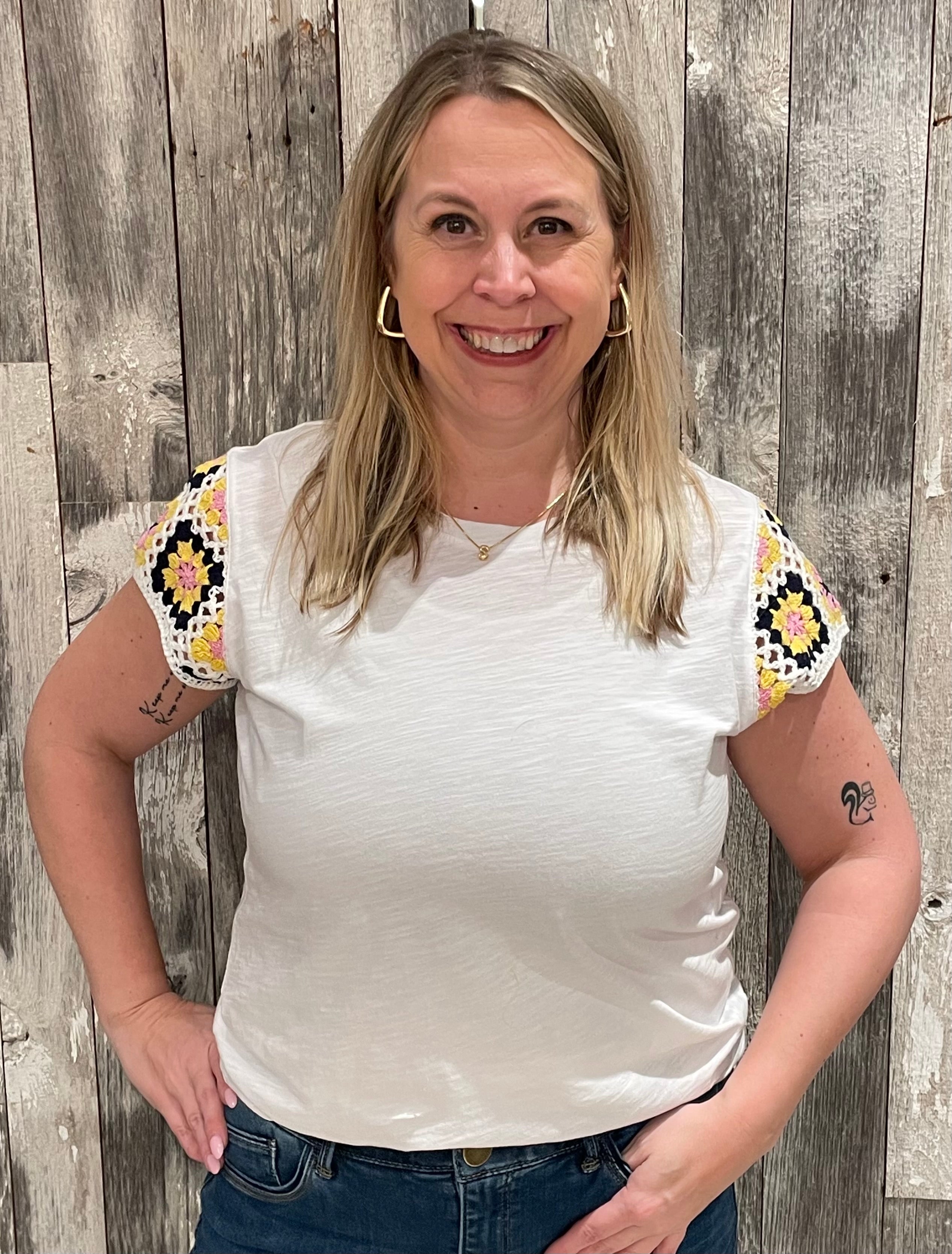 This casual yet charming top combines simplicity with a touch of artistry. Made from soft, breathable fabric, it features a classic white body complemented by crochet floral accents on the sleeves. The vibrant pops of yellow, pink, and navy in the crochet detailing add a playful, handmade feel that elevates its everyday appeal. Perfect for pairing with jeans, shorts, or skirts, this top is a versatile choice for adding a hint of personality to your look.