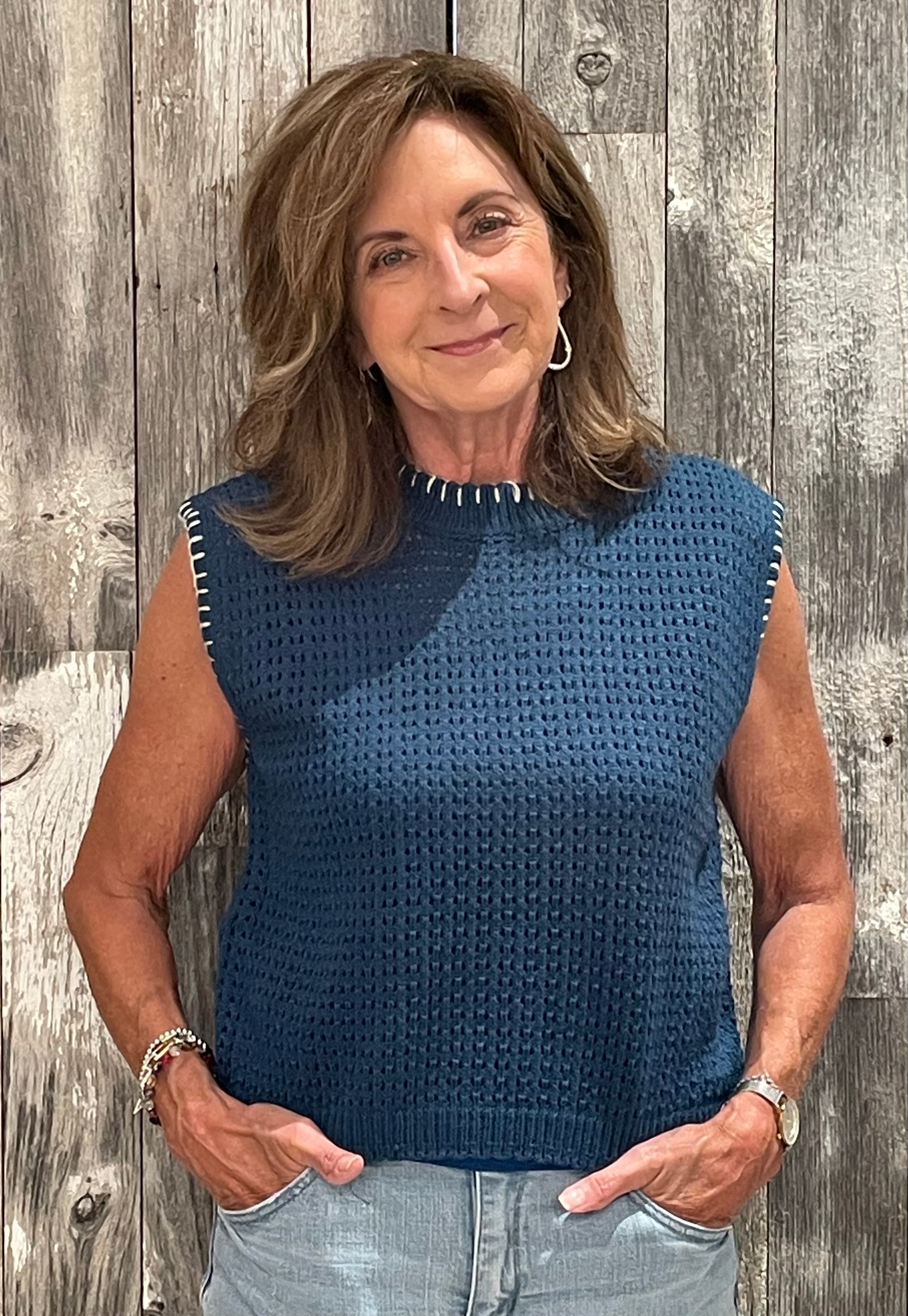 Sleeves: Sleeveless with slightly extended shoulder coverage; armholes also edged with white contrast stitching
