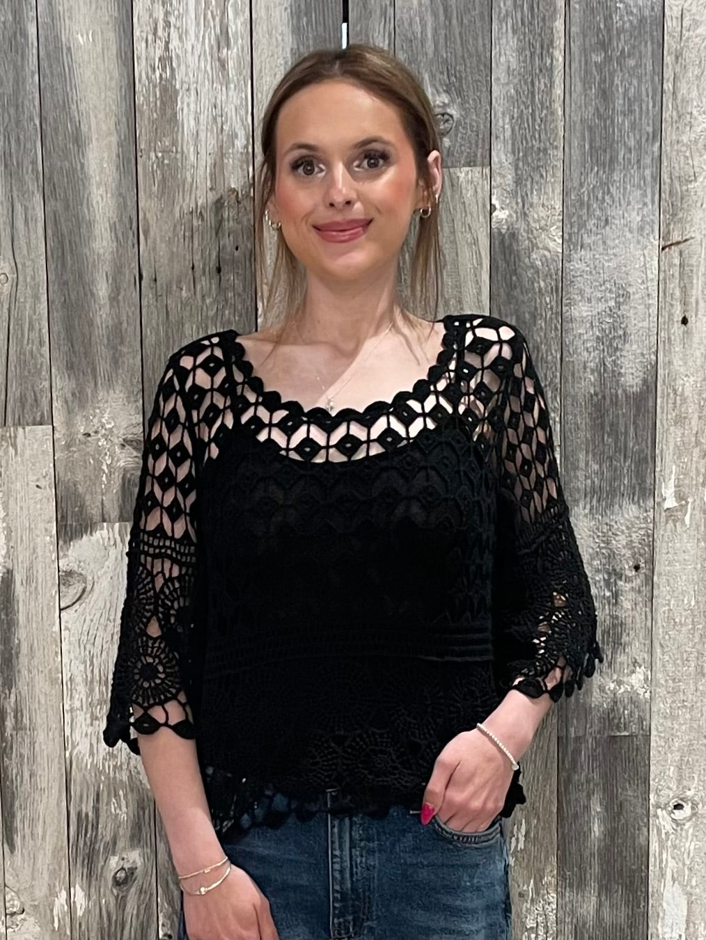 Sleeves: Three-quarter length sleeves with flared, unlined crochet finish