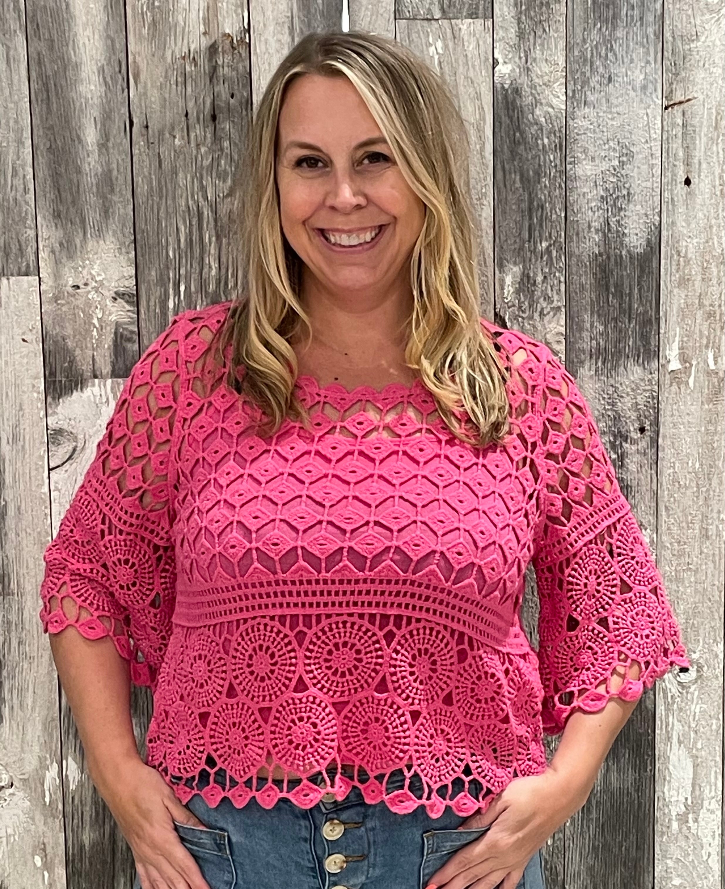 Neckline: Wide scoop neckline with scalloped crochet edging