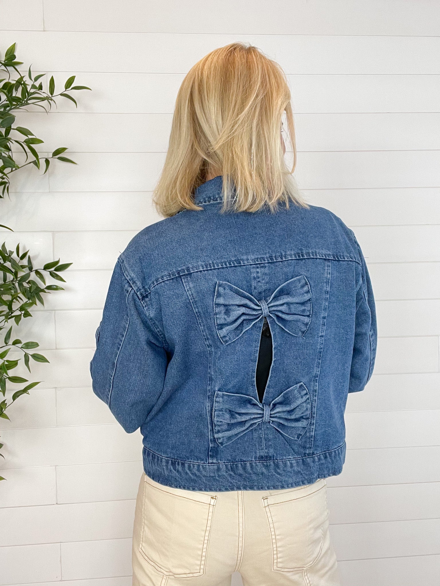 Two vertical back slits adorned with large denim bows, offering a peekaboo effect