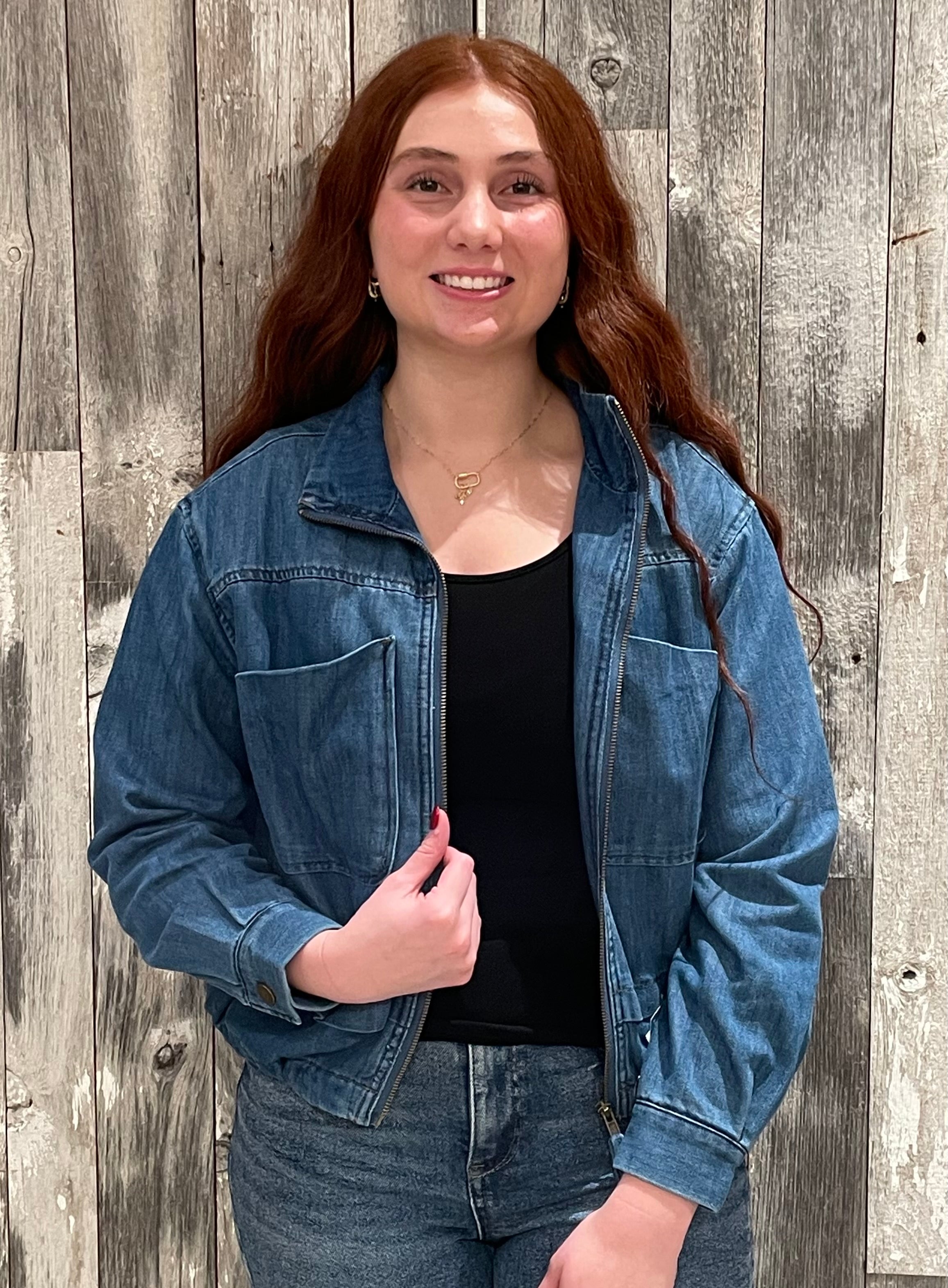 This denim jacket combines a utility-inspired design with a modern, casual look. Featuring a stand collar, front zipper closure, and oversized patch pockets for practicality and style. The adjustable drawstring hem allows for a customizable fit, perfect for layering over your favorite tops or dresses. A versatile piece that adds a touch of effortless cool to any outfit.