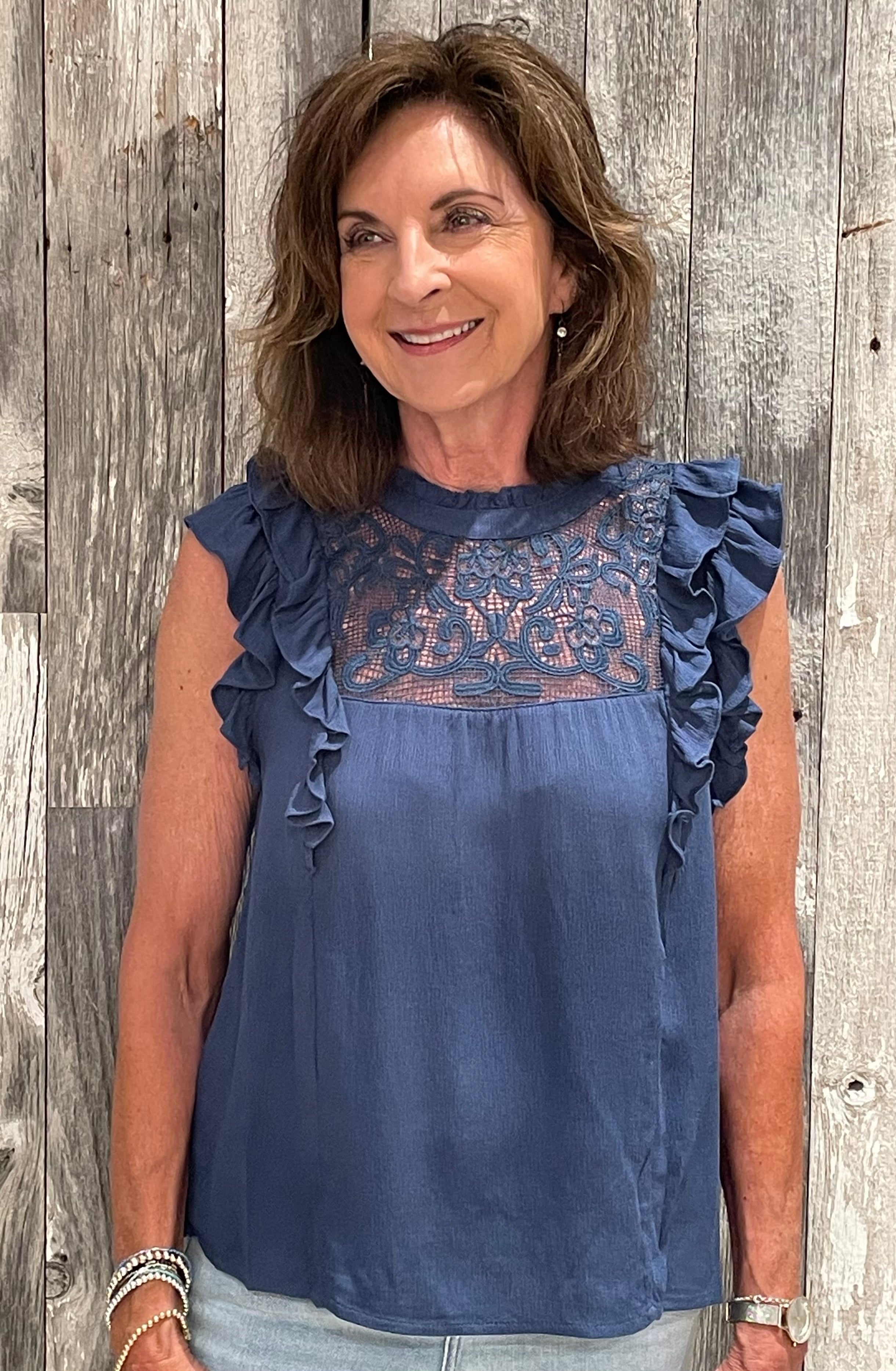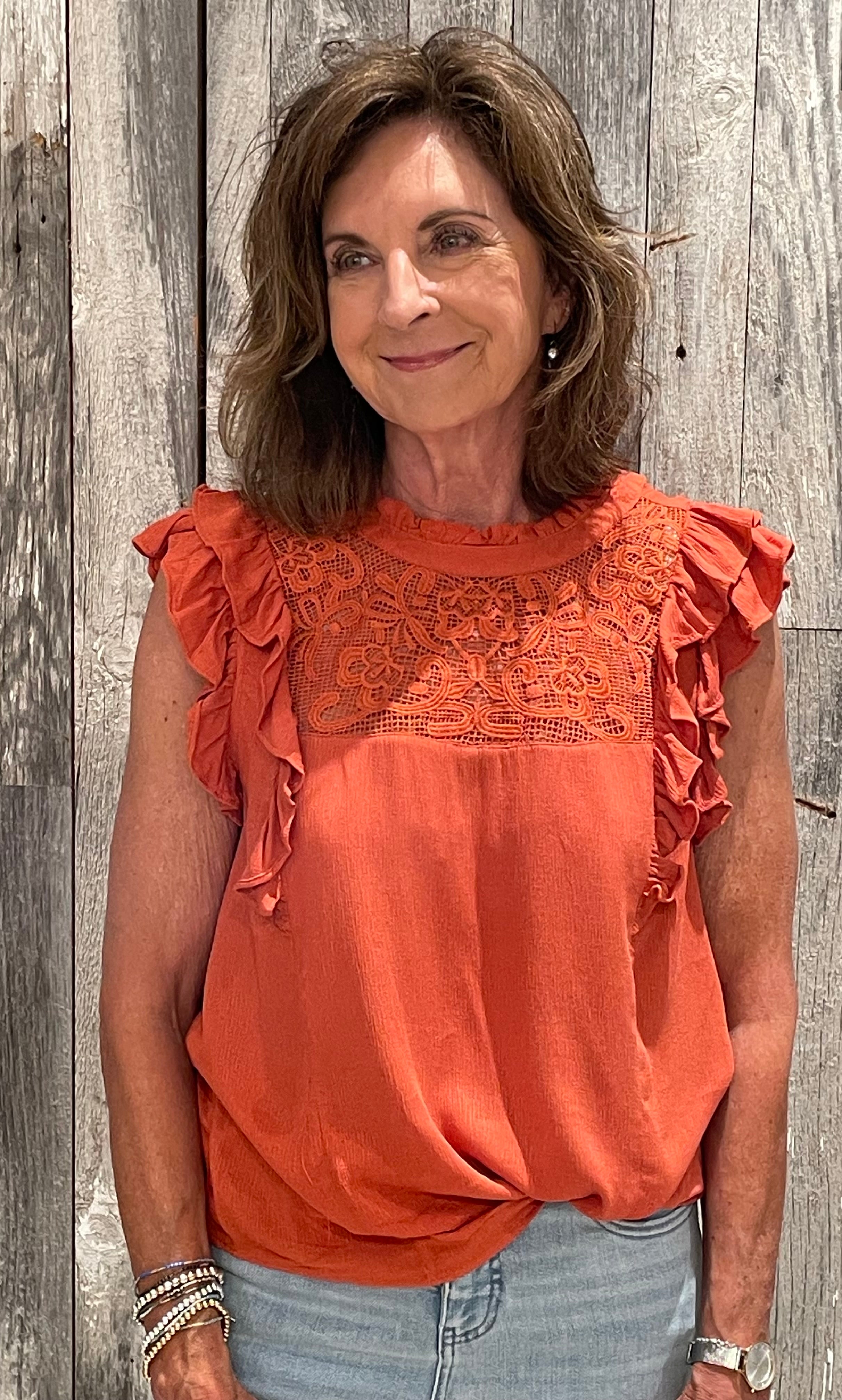 This woven top in Moroccan Blue and Persimmon Red features double ruffle short sleeves, a round neck, and a diecut embroidered yoke, creating a feminine and sophisticated appearance.