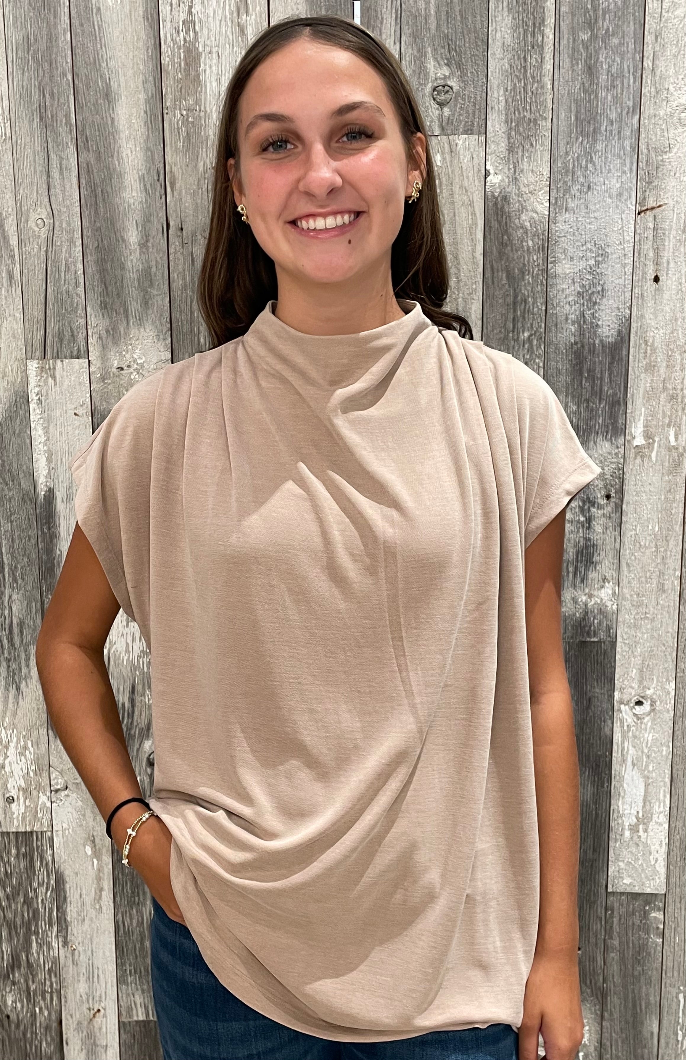 Style: Draped mock-neck top