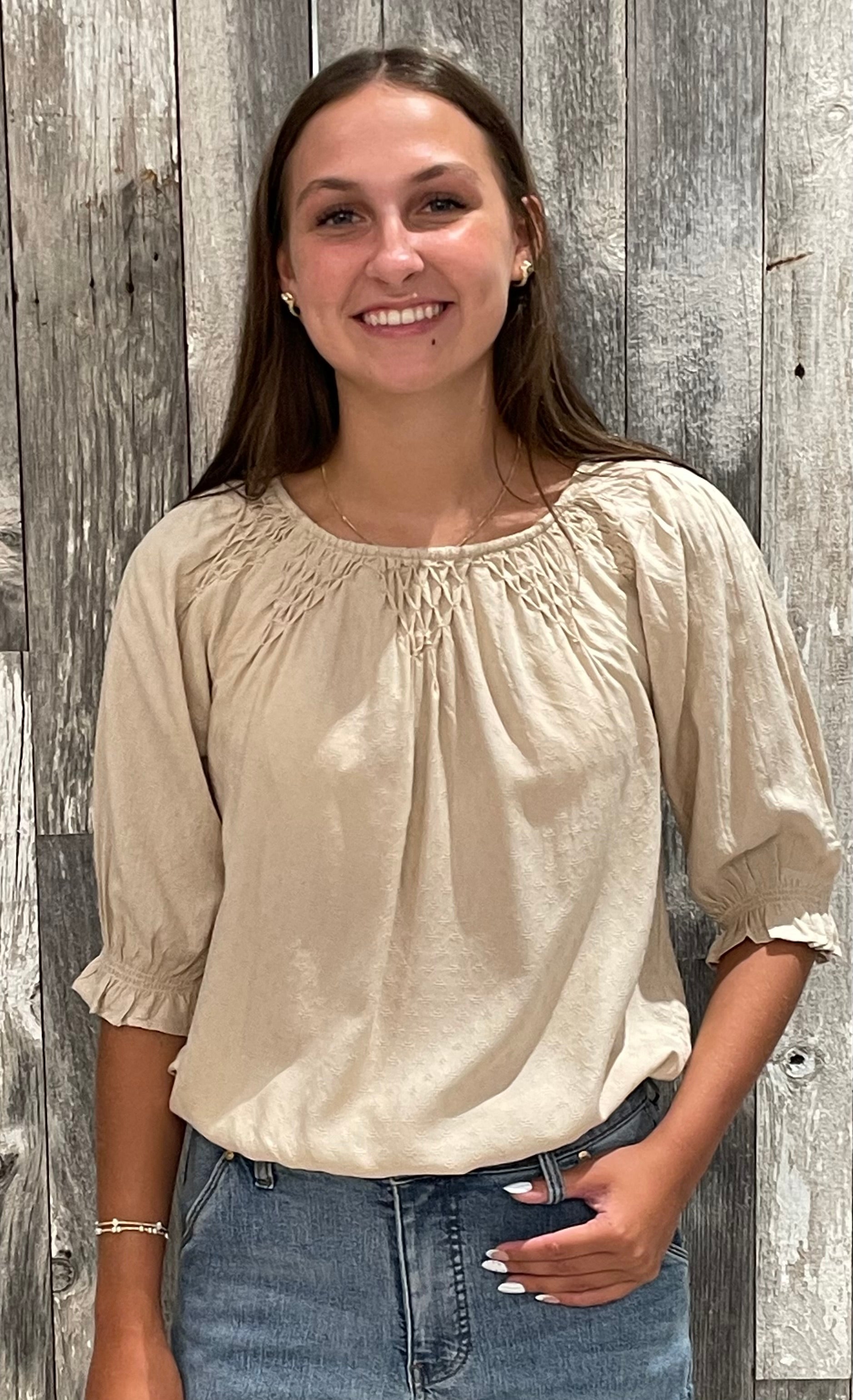 Neckline: Wide, rounded neckline with smocking detail across the shoulders and upper chest
