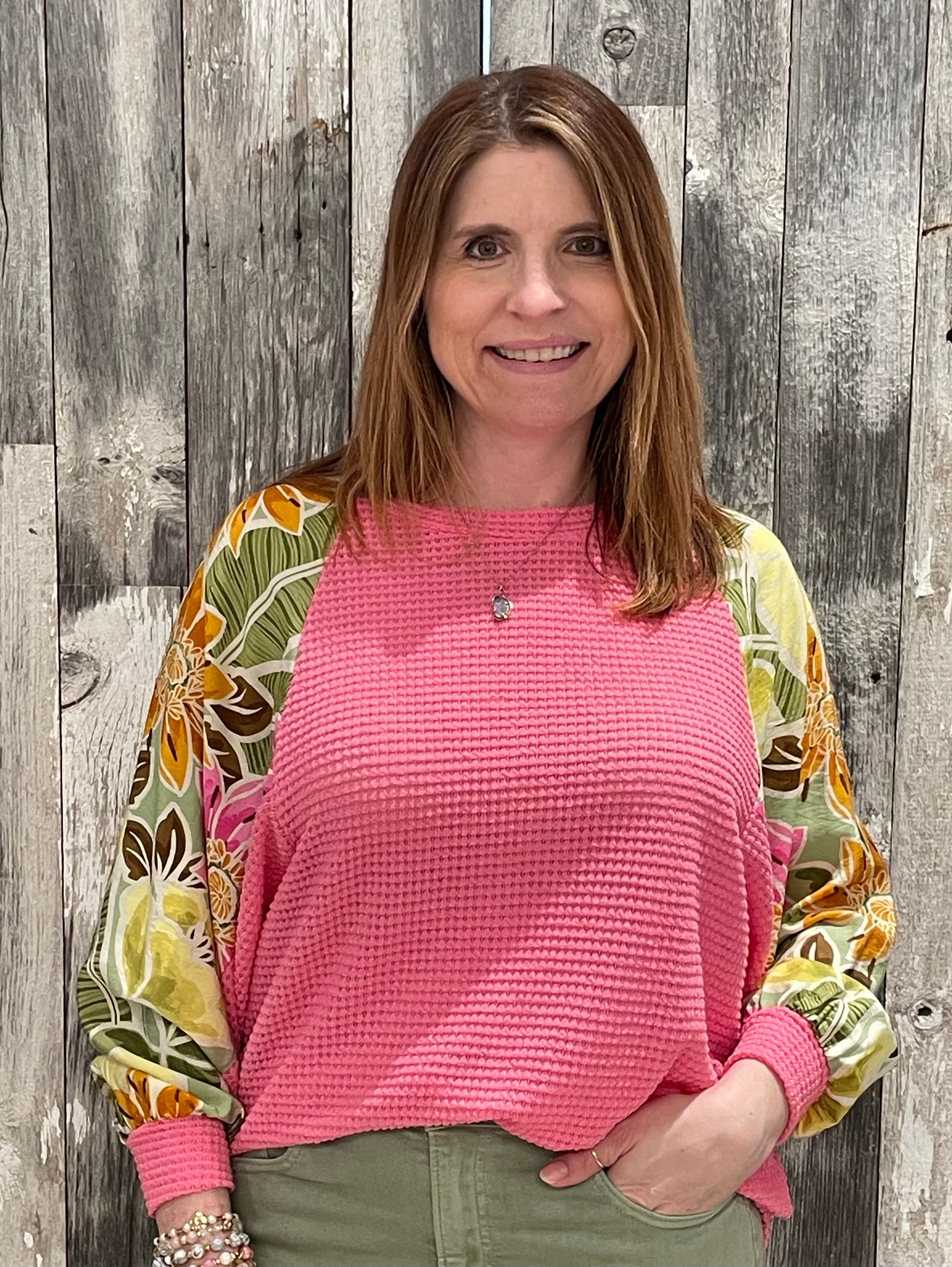 Design: Loose-fitting sleeves with gathered cuffs that match the main pink fabric.