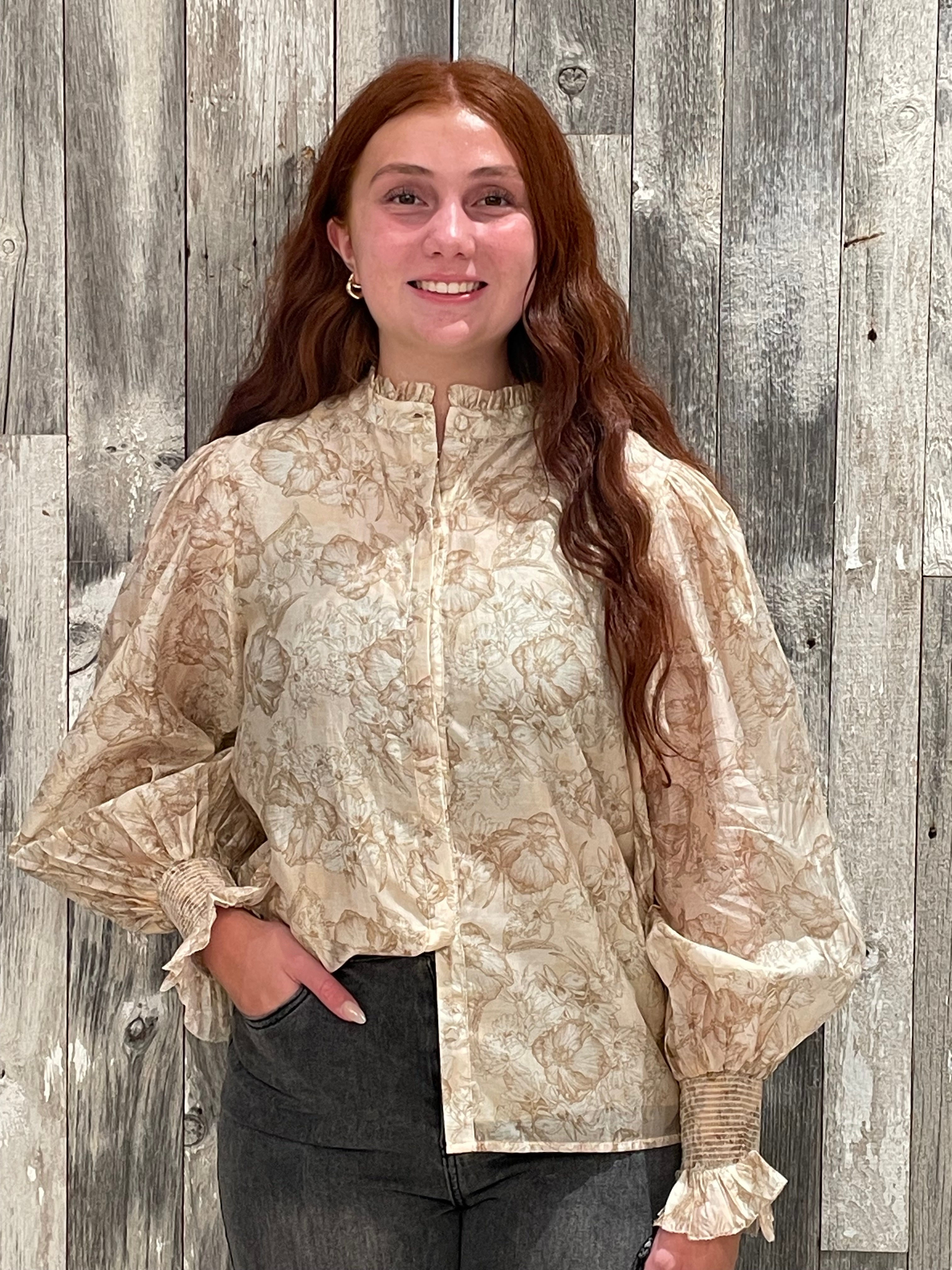 Floral Tencel Blend Fabric Ruffle Neck Blouse