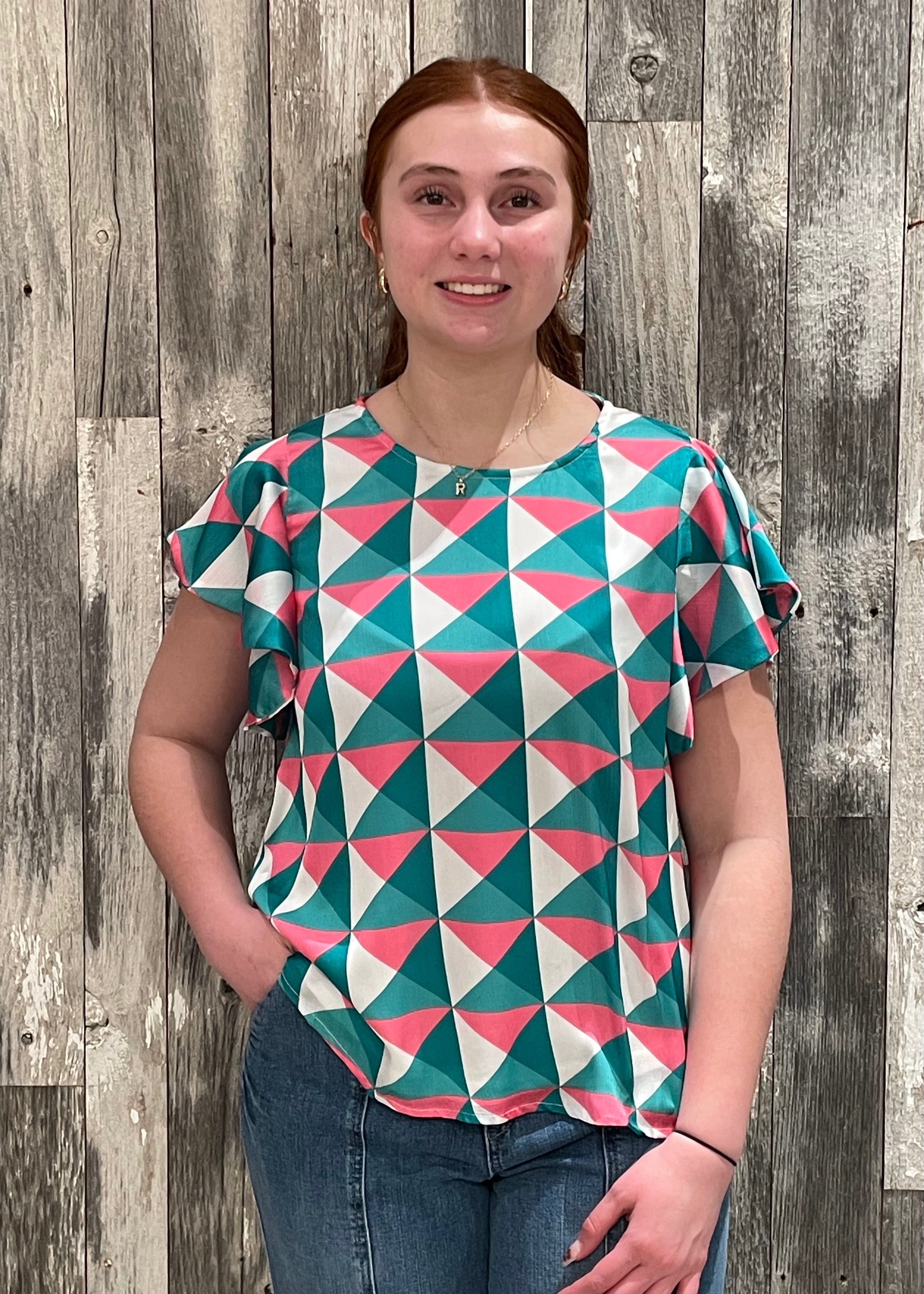 Add a touch of playfulness to your wardrobe with our Flutter Sleeve Print Woven Top. The flirty flutter sleeves and eye-catching print will have you feeling light and carefree. Perfect for any occasion, this top is a must-have for adding a unique flair to your style.