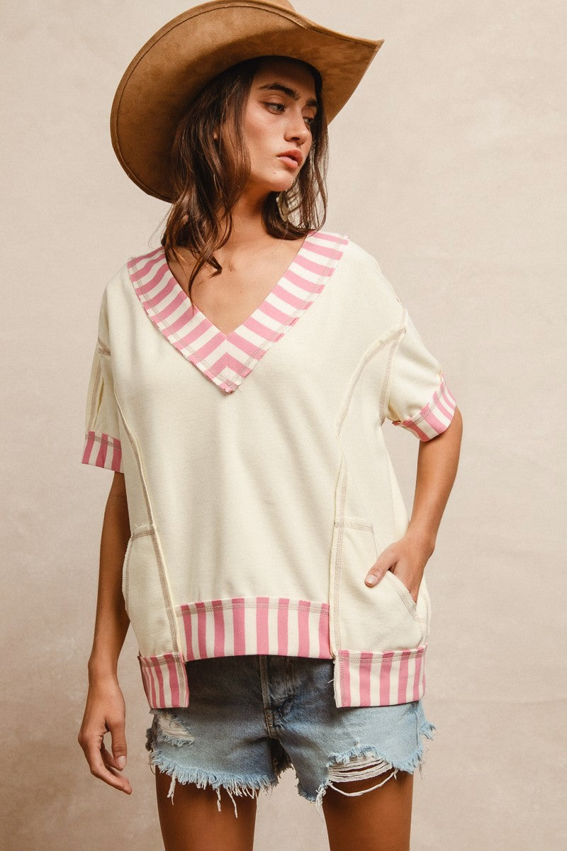 French Terry And Stripe Mixed V Neck Top w/ Reverse Hem