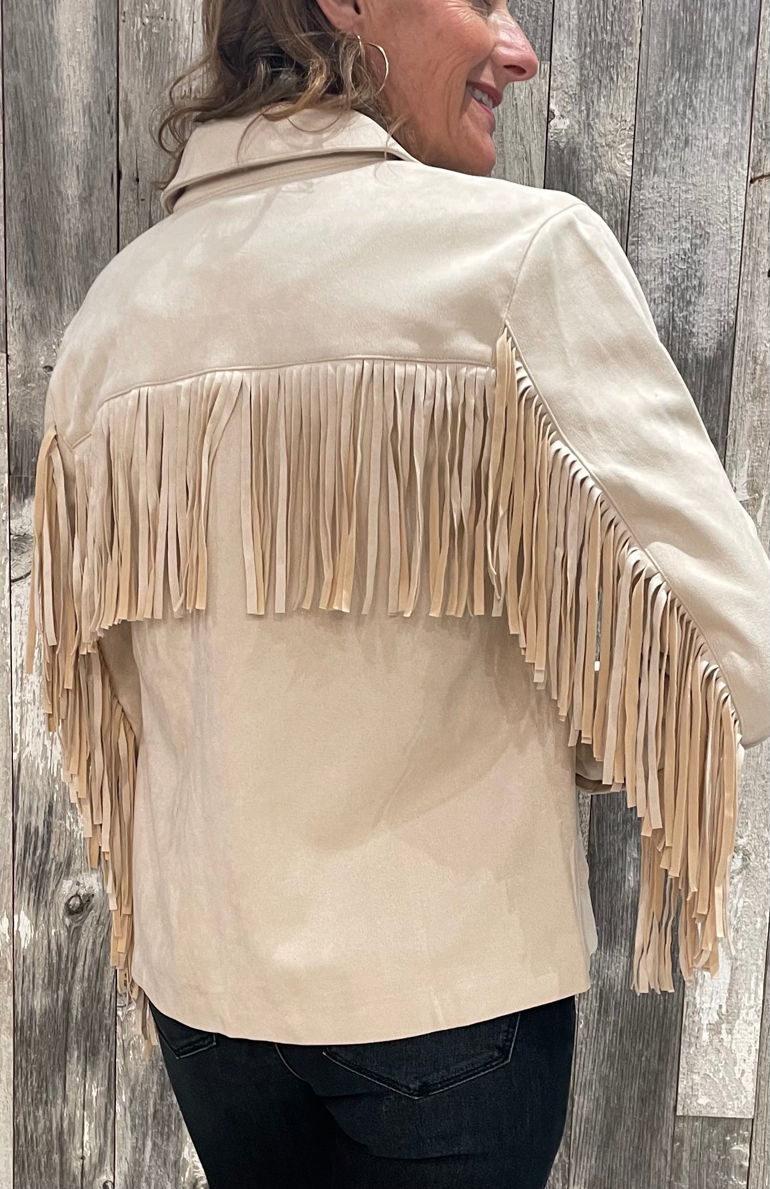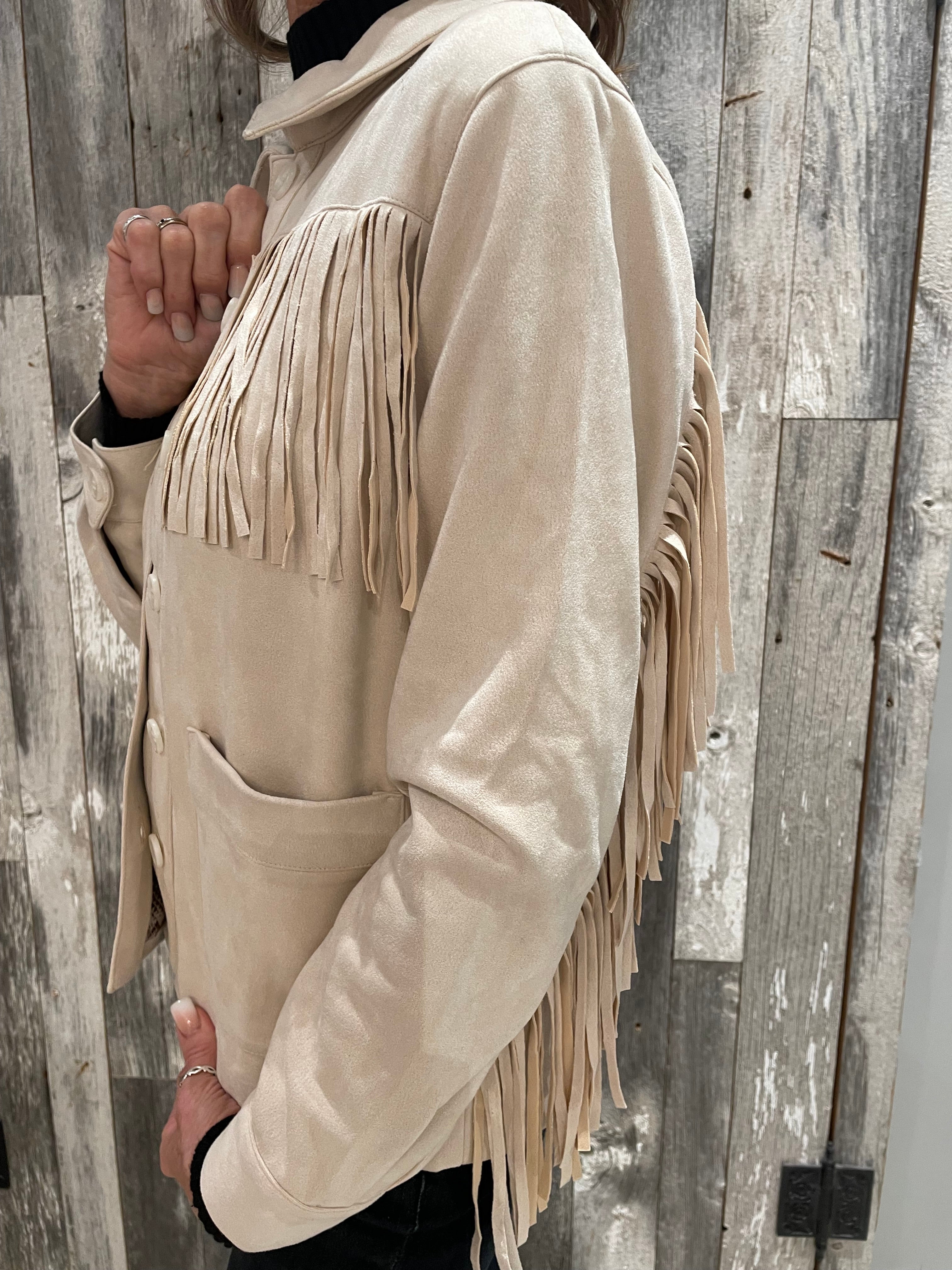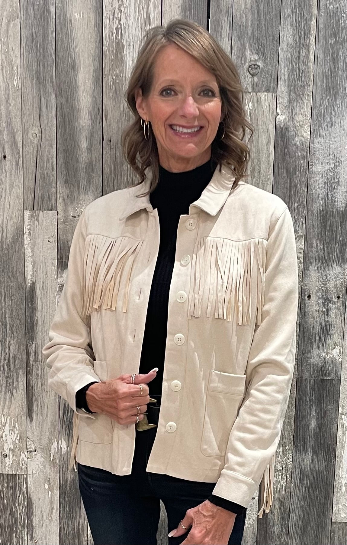 The Fringe Detail Faux Suede Utility Jacket takes a classic shape and gives it a playful, free-spirited twist. Designed in soft faux suede with just the right amount of stretch, this jacket features a timeless utility cut with a button-up front, two top-entry pockets, and a crisp collar. The fringe is where the fun begins—draped across the front, running down the sleeves, and swinging across the back for movement that makes every step feel like a statement. Fully lined for comfort, this jacket brings together structure, style, and a whole lot of personality.