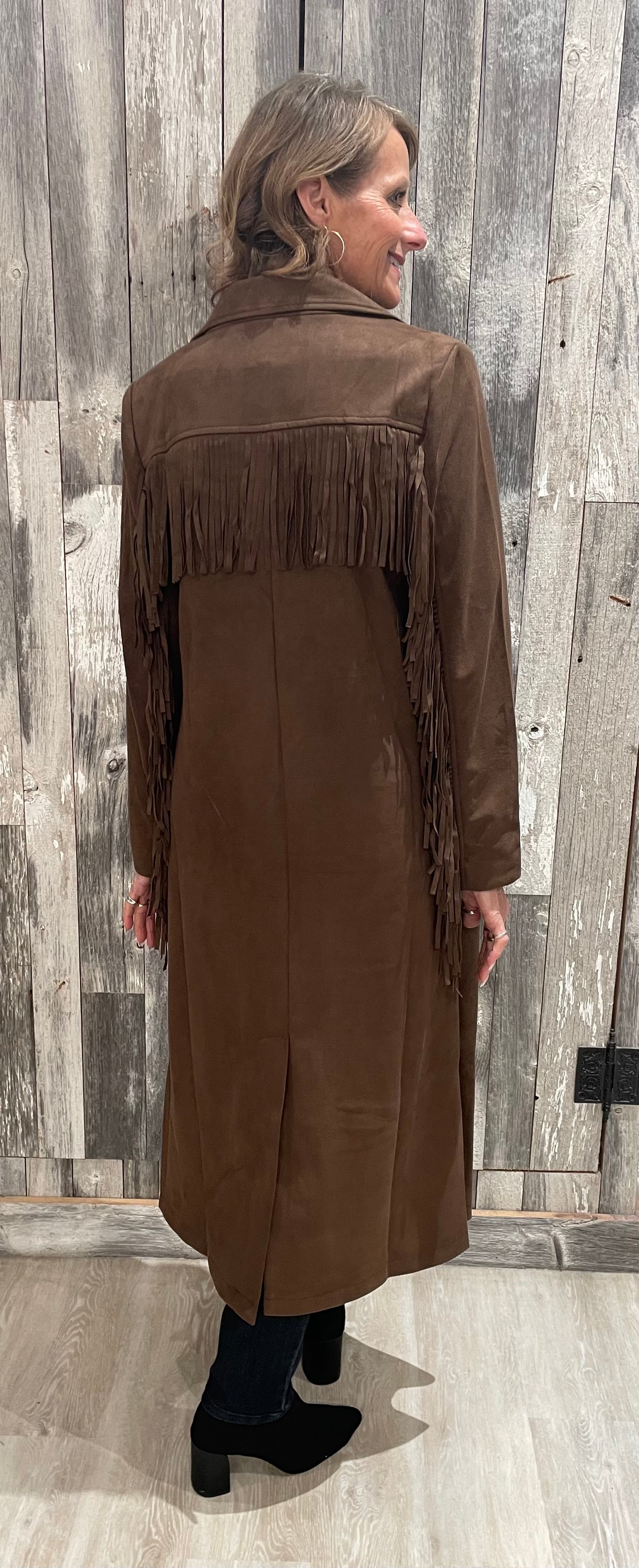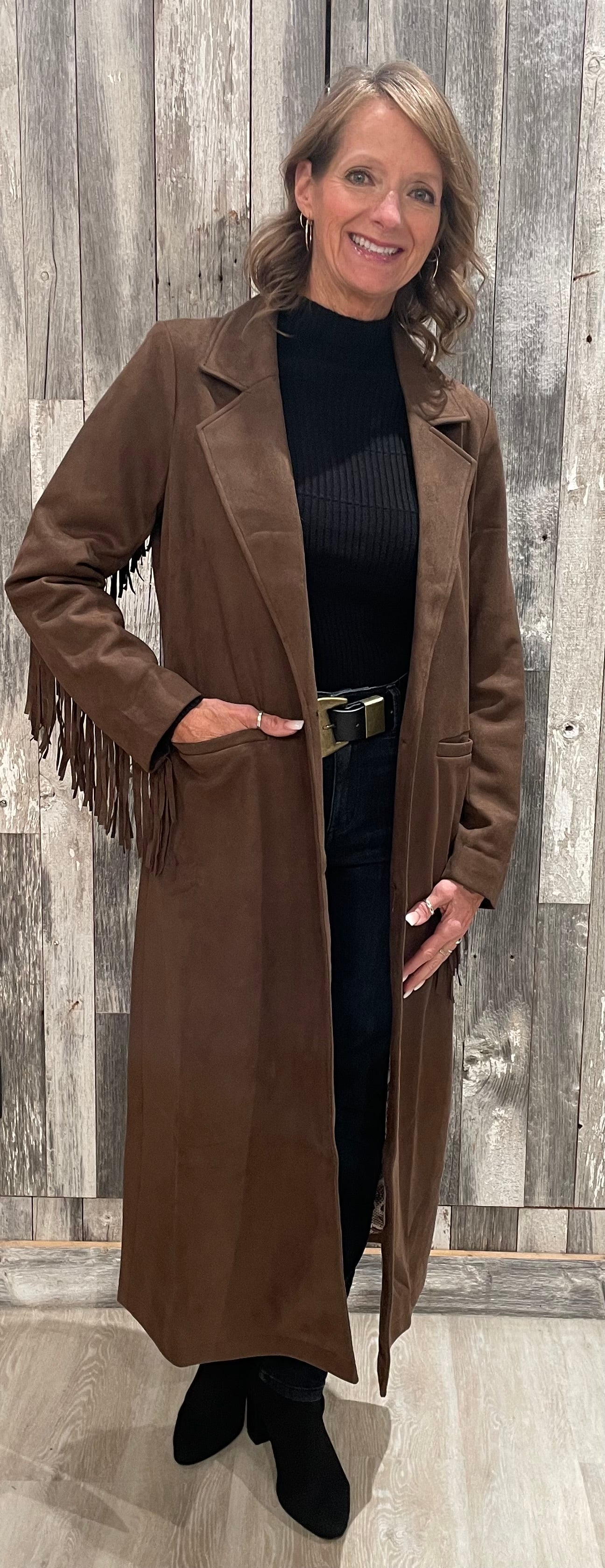 Turn heads this season with the Fringe Trim Faux Suede Coat—a statement layer that blends western flair with polished tailoring. Crafted in soft faux suede with a touch of stretch, this coat features a classic blazer-inspired silhouette with a notch lapel, button-front closure, and sleek top-entry pockets. The real star? Swingy fringe detailing that cascades down the arms and across the back, bringing plenty of movement (and compliments) wherever you go. Fully lined for comfort and warmth, it’s the perfect mix of fun and functional.