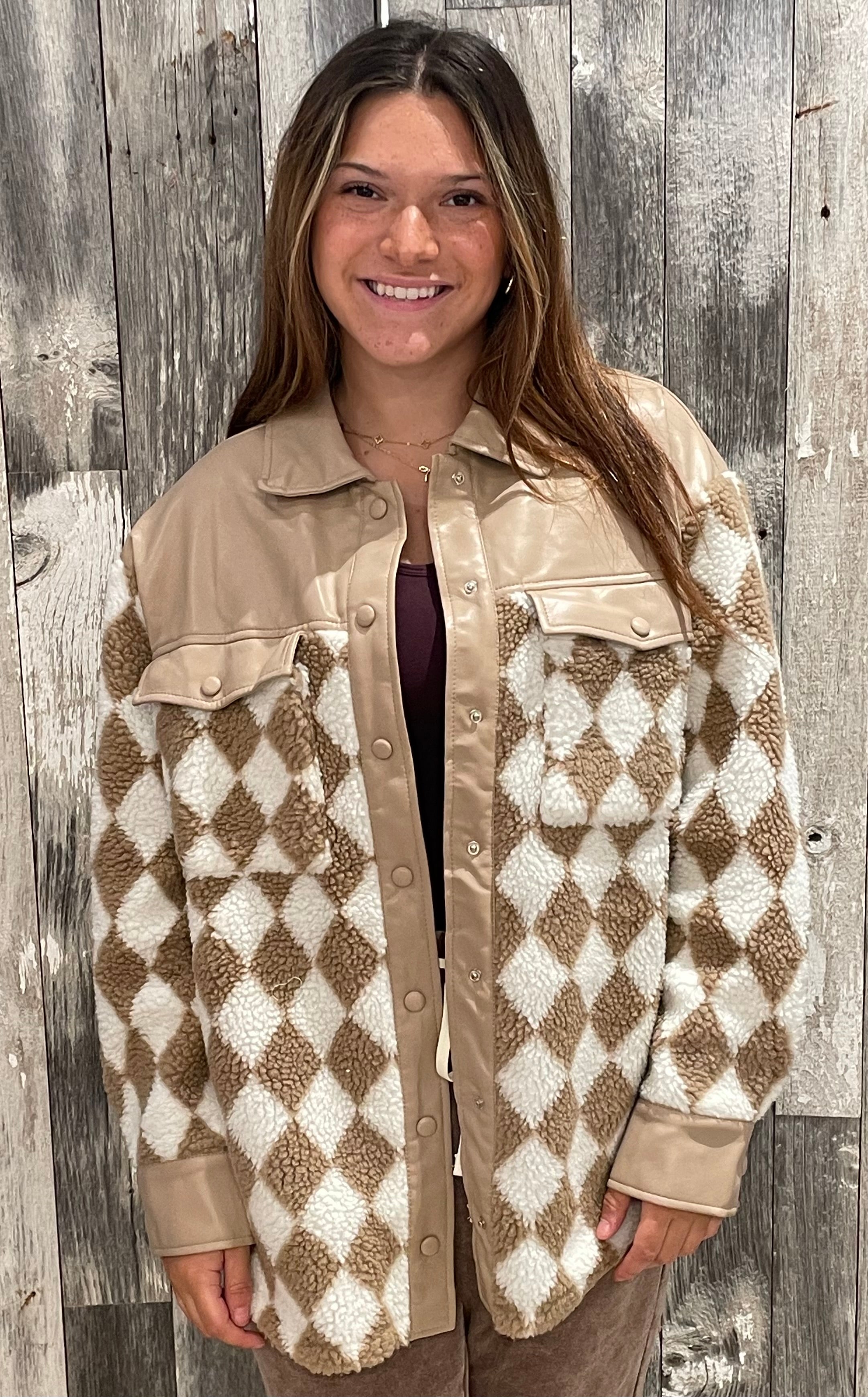 • Bold Harlequin Pattern: The fuzzy harlequin design adds a playful and stylish twist to a classic jacket silhouette.