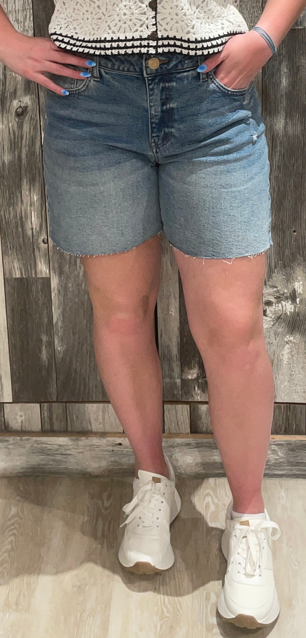 - These high rise shorts feature a longer inseam, medium wash, and subtle distressing on the front and back, and raw hem for a stylish, laid back look. Perfect for everyday wear.