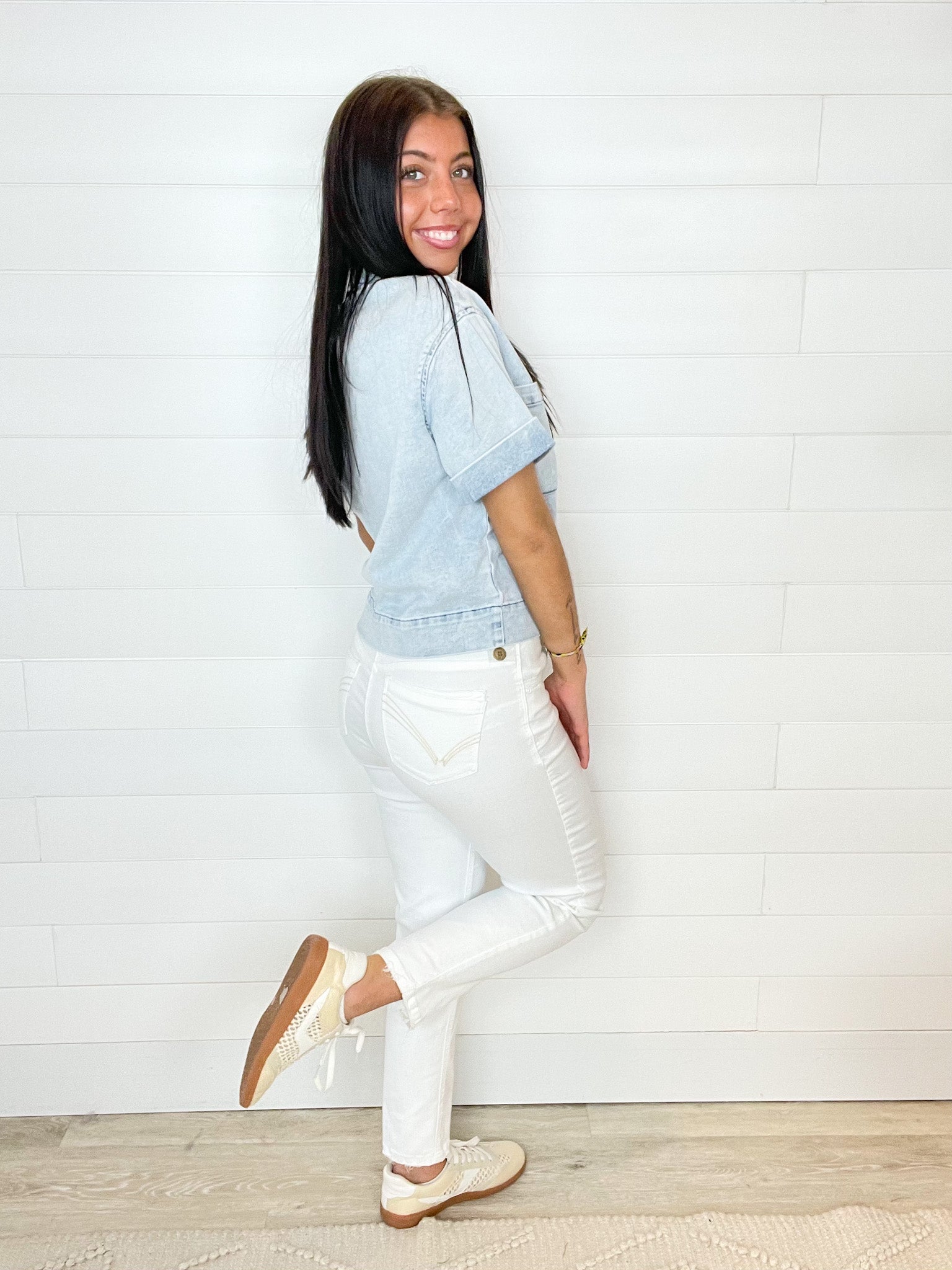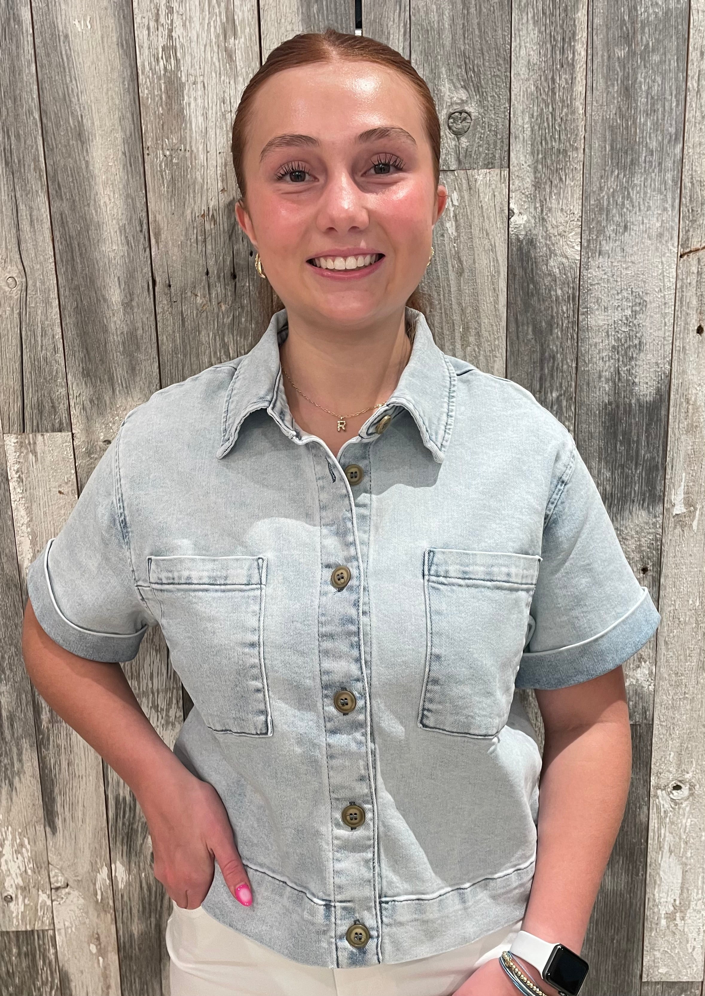 This boxy, button-front camp shirt in light wash denim is a unique find. With its short sleeves, front pockets, and laid-back design, it effortlessly combines style and comfort for a relaxed, trendy look. Perfect for adding a touch of individuality to your wardrobe.