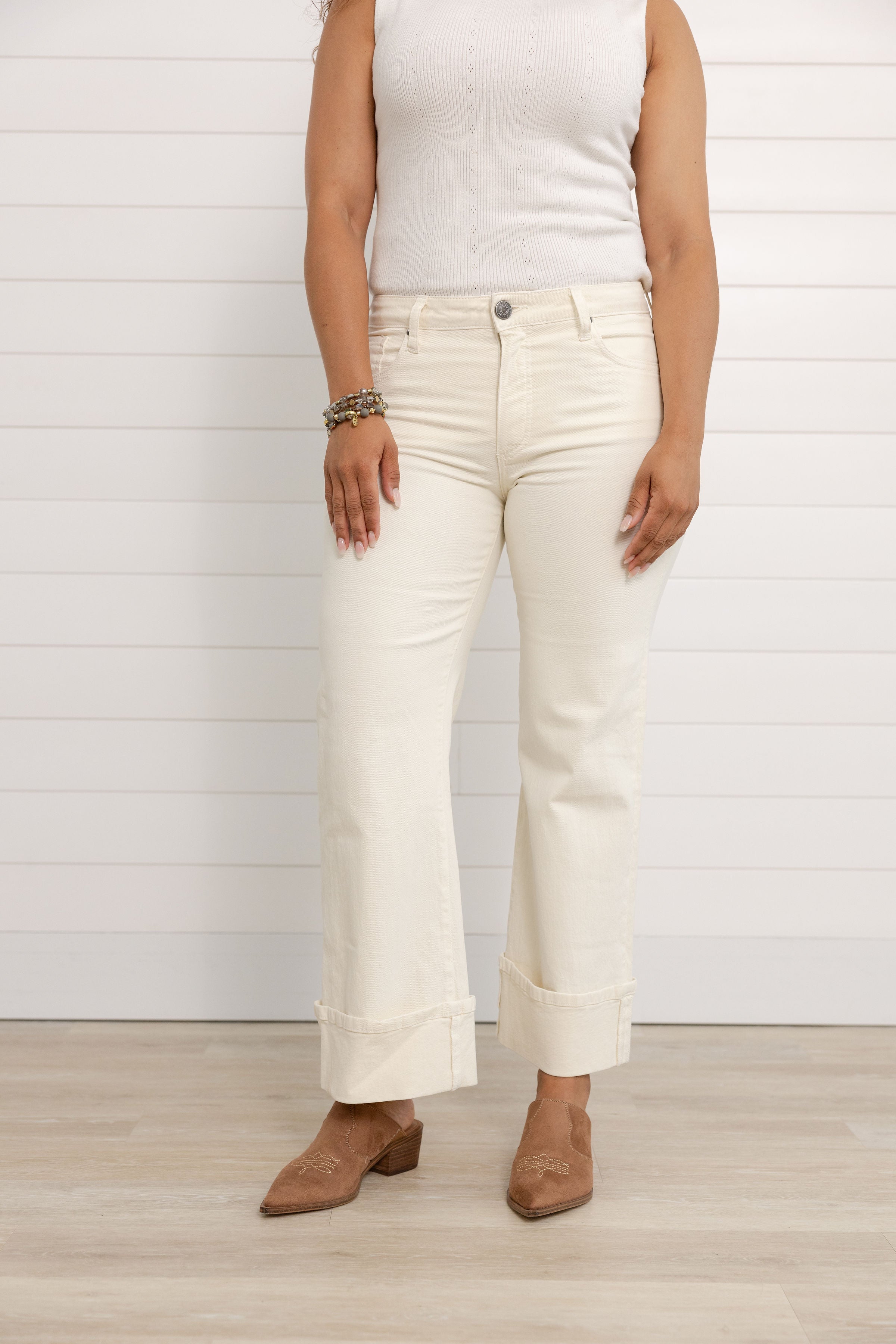 - these high-rise wide-leg jeans feature Fab Ab and a trendy roll-up hem. Made with just the right touch of stretch and crafted in a perfect off-white shade, they’re your go-to for versatile, easy styling.