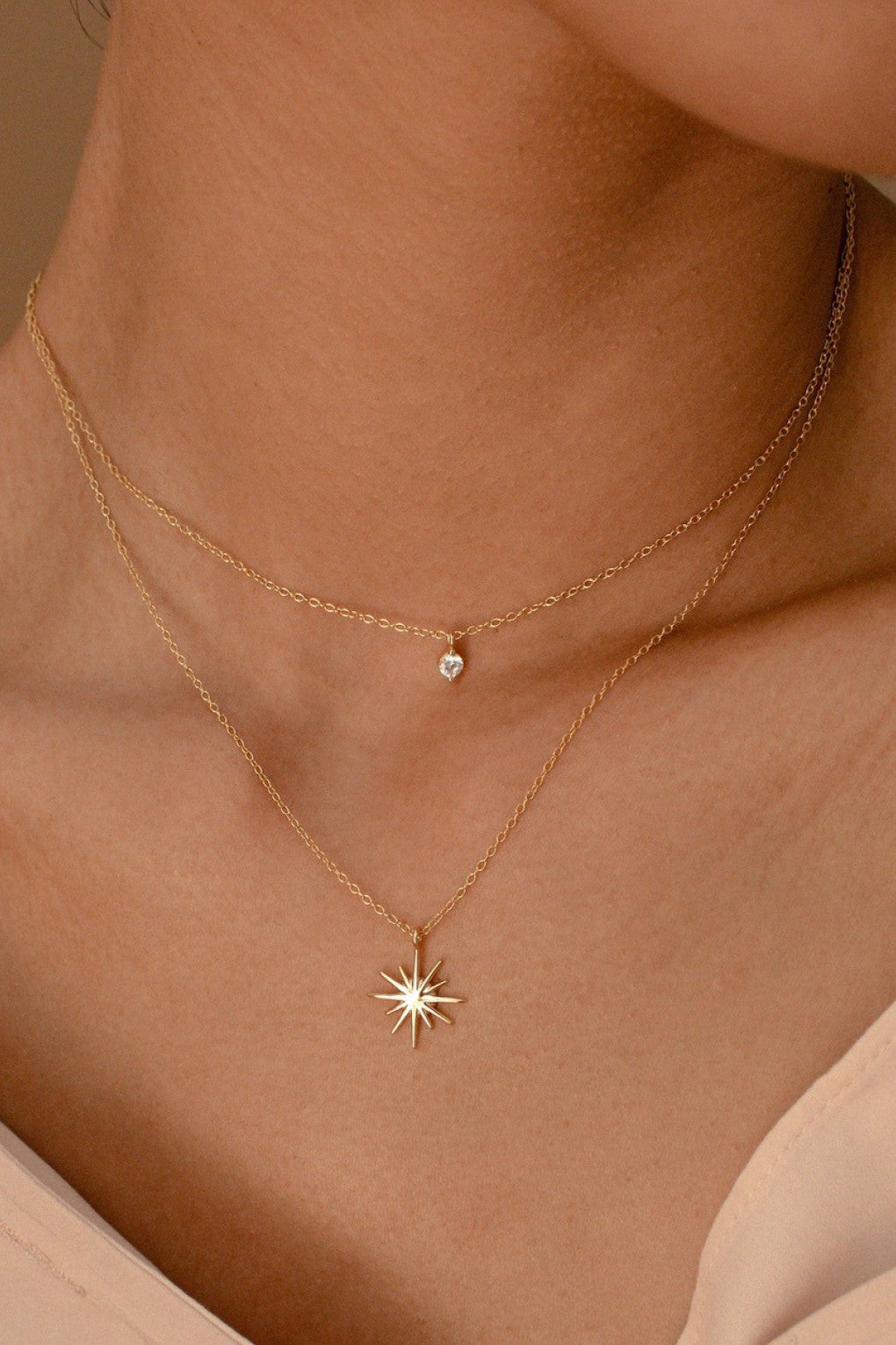 Sparkling Details: Upper chain adorned with a small crystal charm; lower chain showcases a radiant starburst pendant.