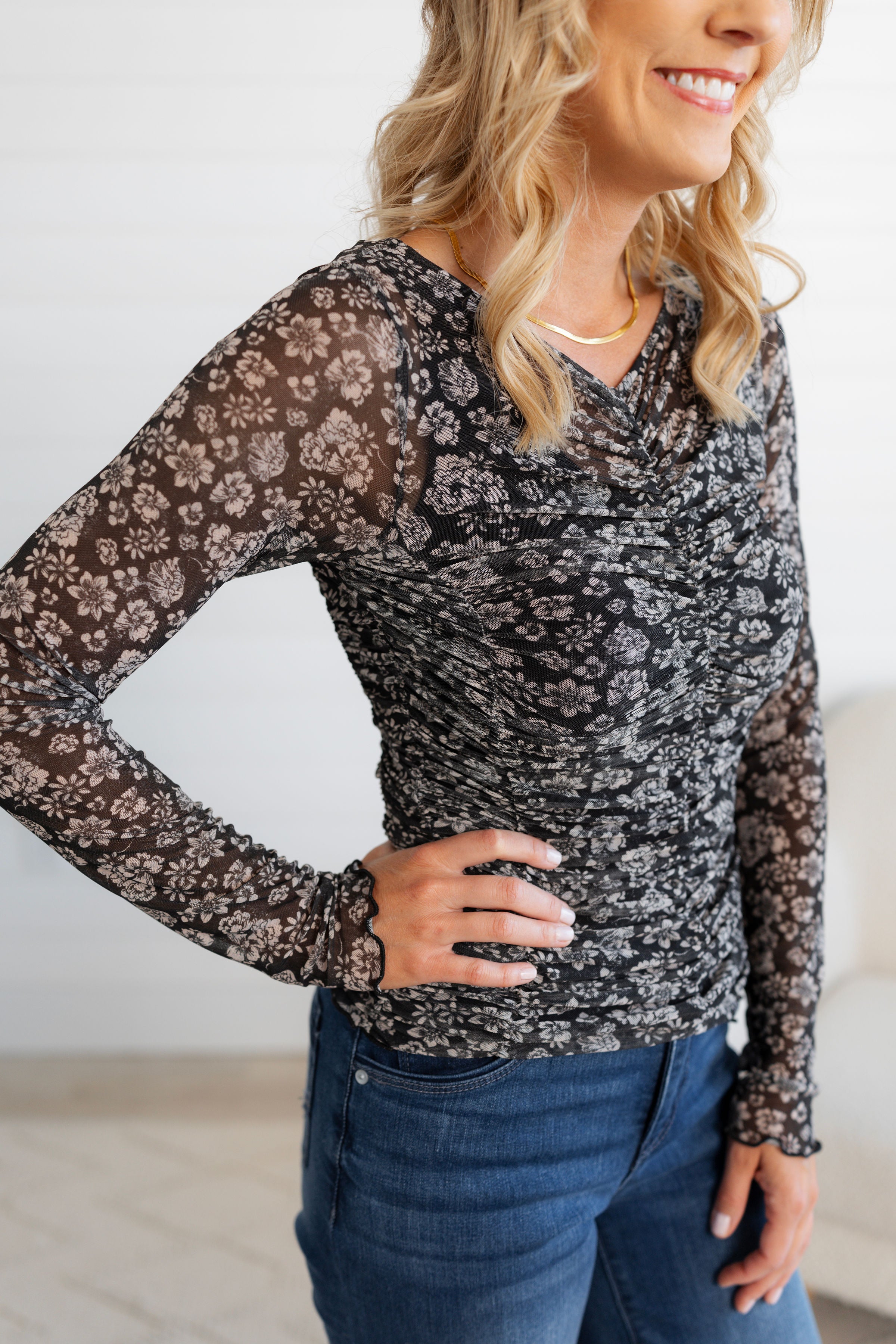 The Lettuce Hem Mesh Print Top is fitted and fabulous with allover ruching that hugs in all the right places. A deep v-neckline adds a hint of drama, while the delicate lettuce hem gives it that perfect playful finish. Lightweight and stretchy, it's the ultimate layering piece—or wear it solo for a bold, confident vibe.