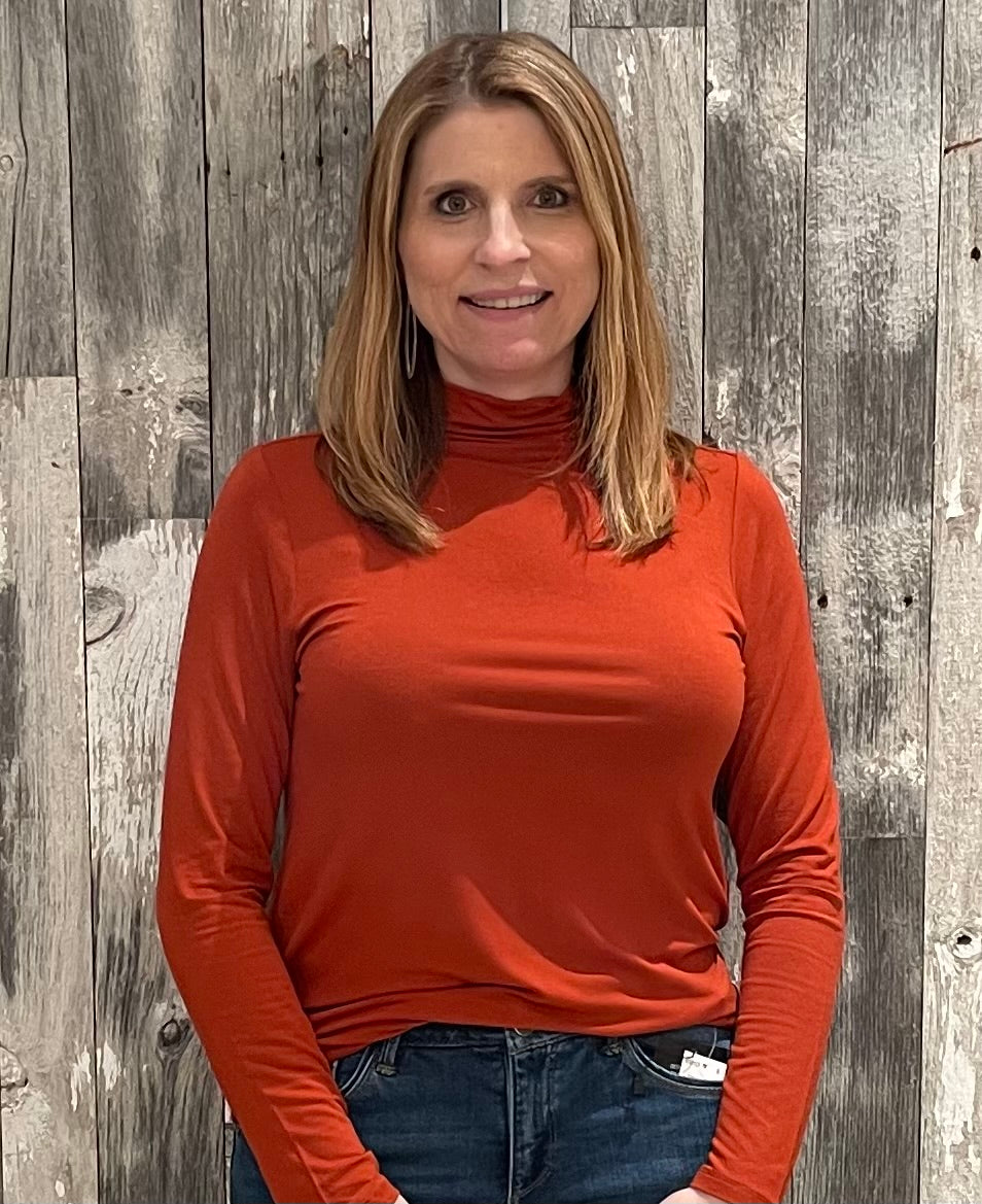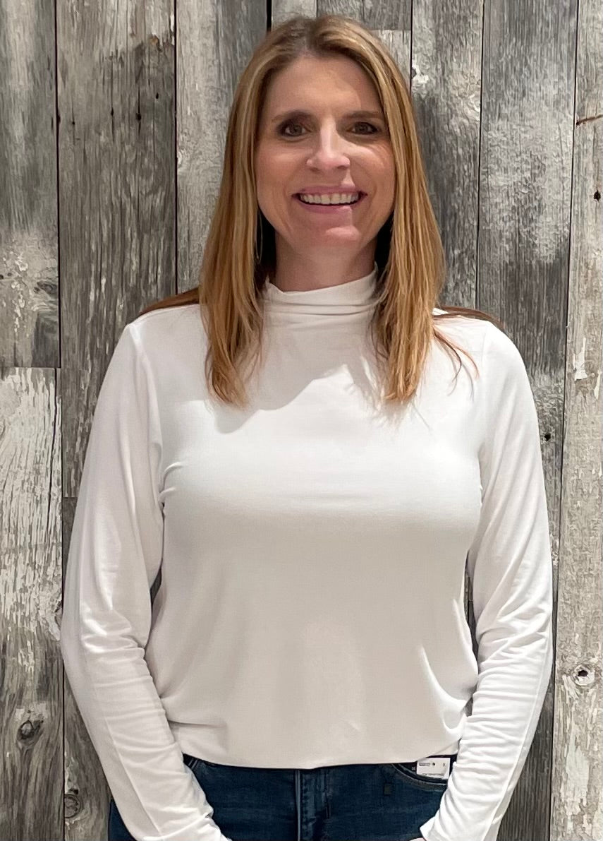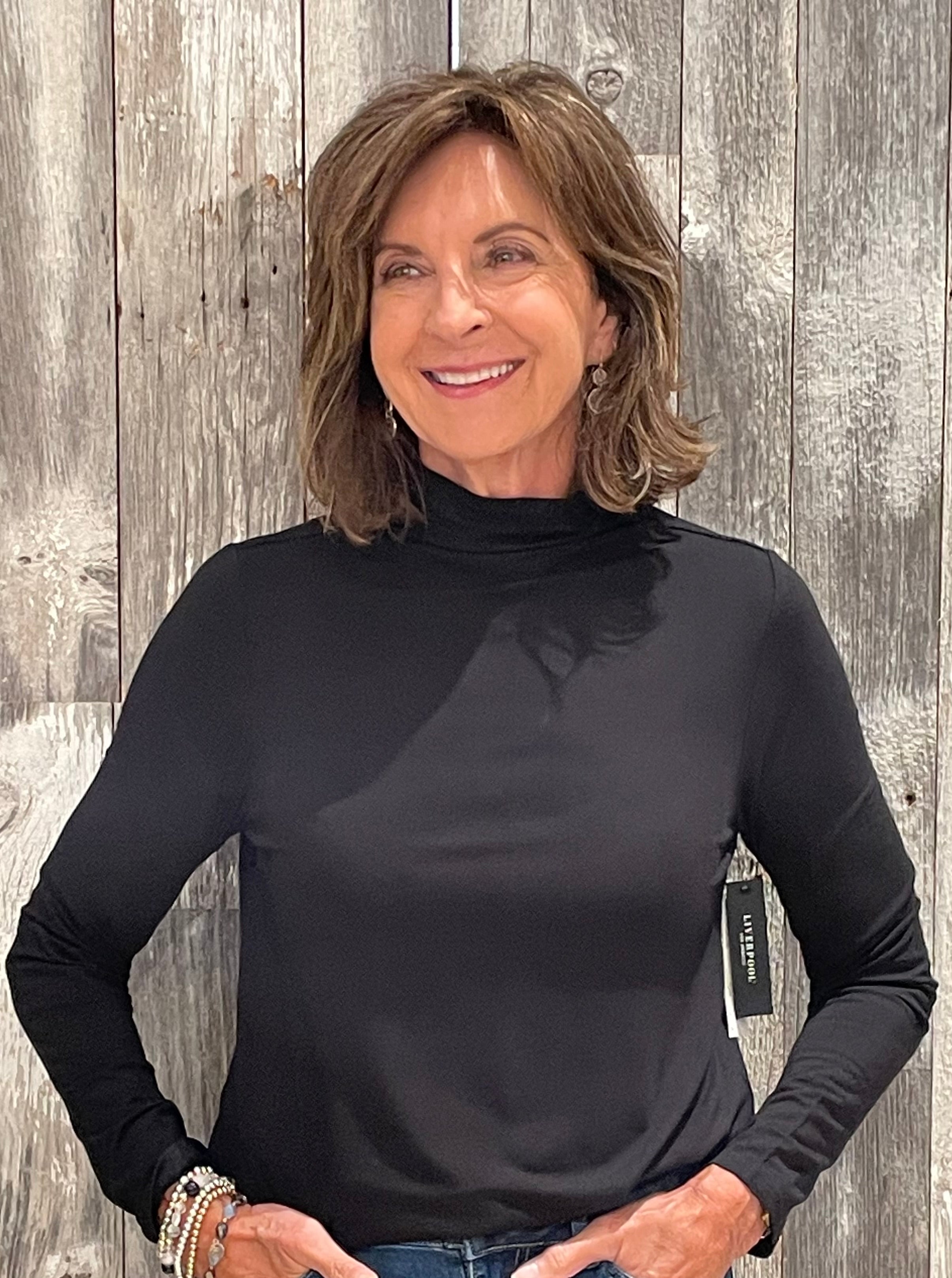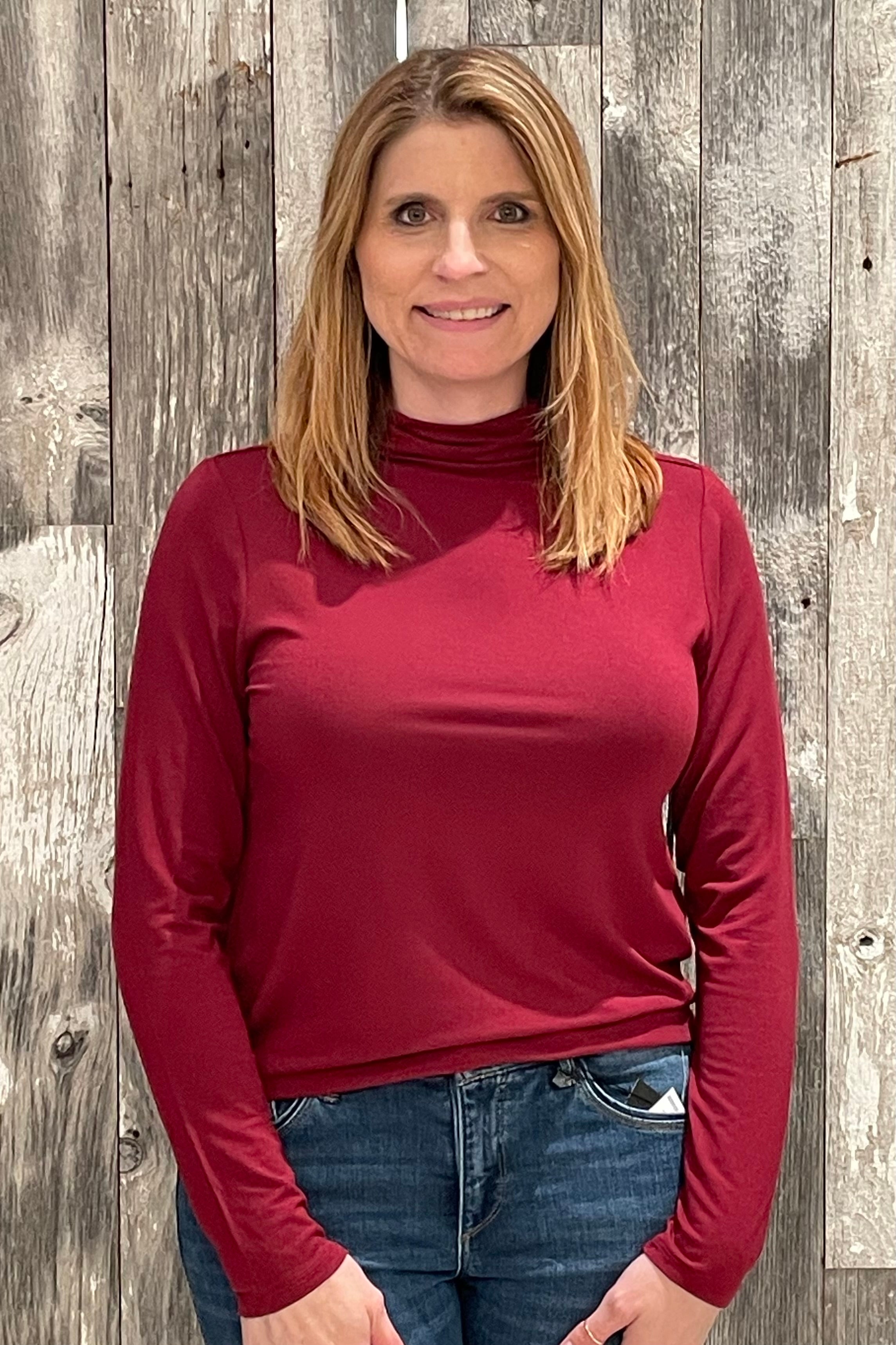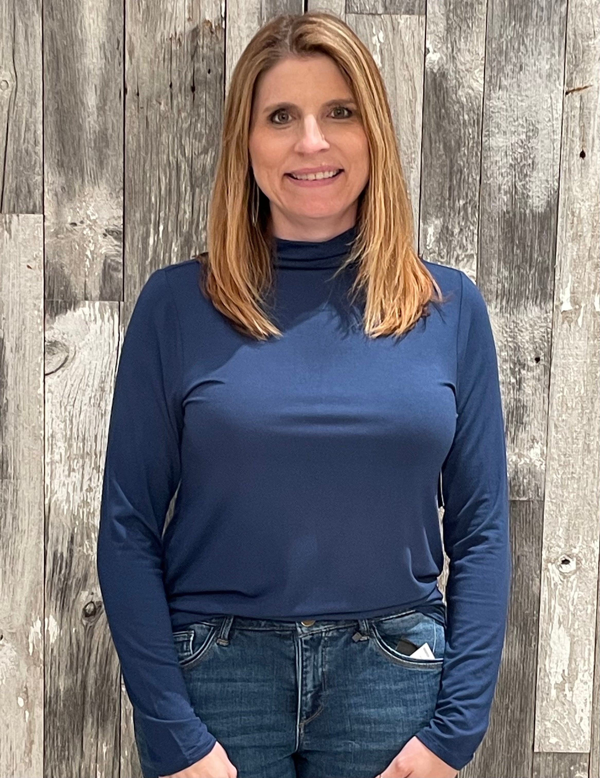 The perfect mock neck long sleeve basic knit top. Super comfortable and easy to wear under a blazer or denim jacket! 24" Front body length. Mock neck. Straight hem finish. Ultra soft knit. Semi-fitted. Rayon, Spandex.