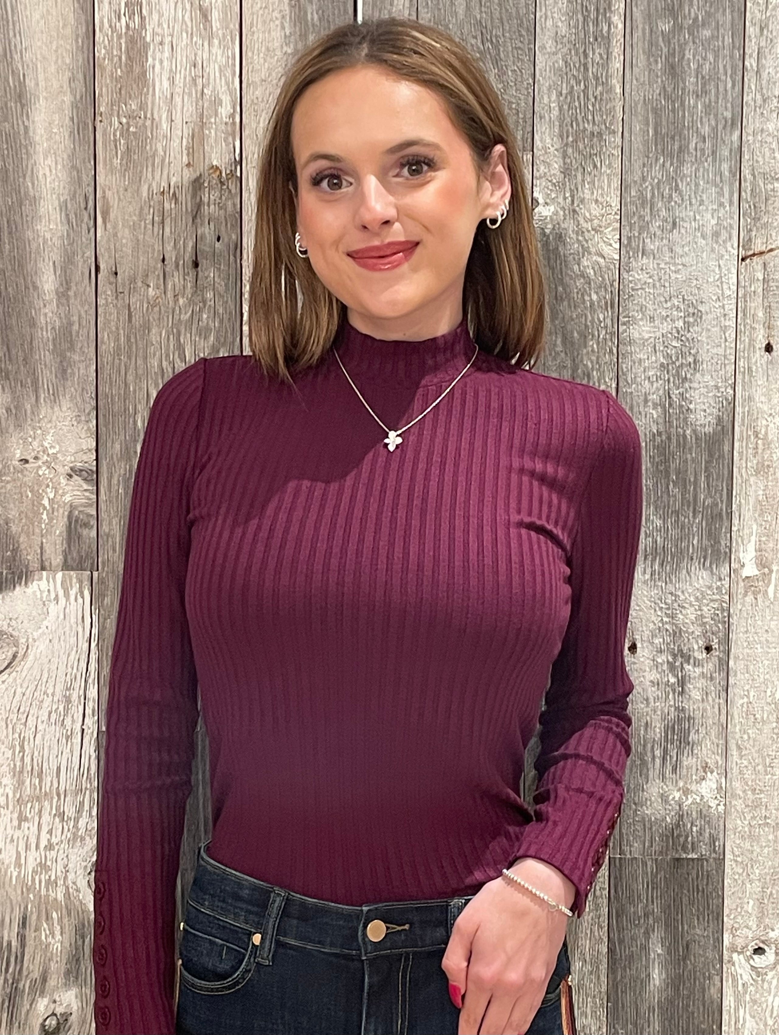 An everyday go-to, made better. This rib-knit mock neck top delivers refined ease with long sleeves, a straight hem, and subtle button details at the cuff. Soft and easy to wear, it’s a versatile staple that moves seamlessly between seasons—and looks good in every color.