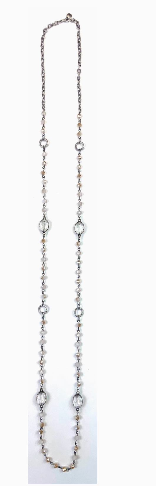 The Long Thin Rosaried Beaded Necklace is an elegant accessory with a timeless design, perfect for layering or wearing alone.