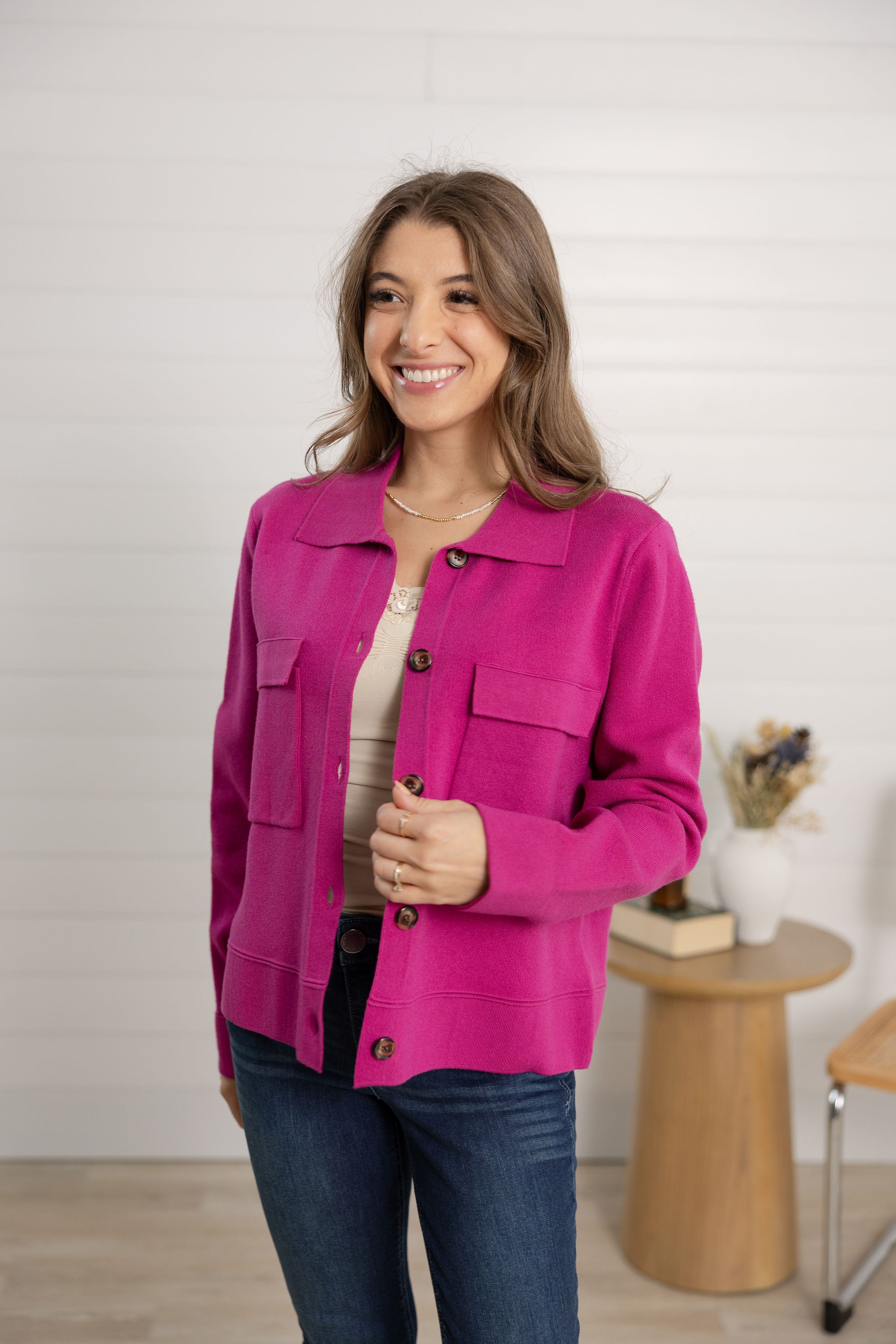 Closure: Front button closure with dark tortoiseshell-style buttons