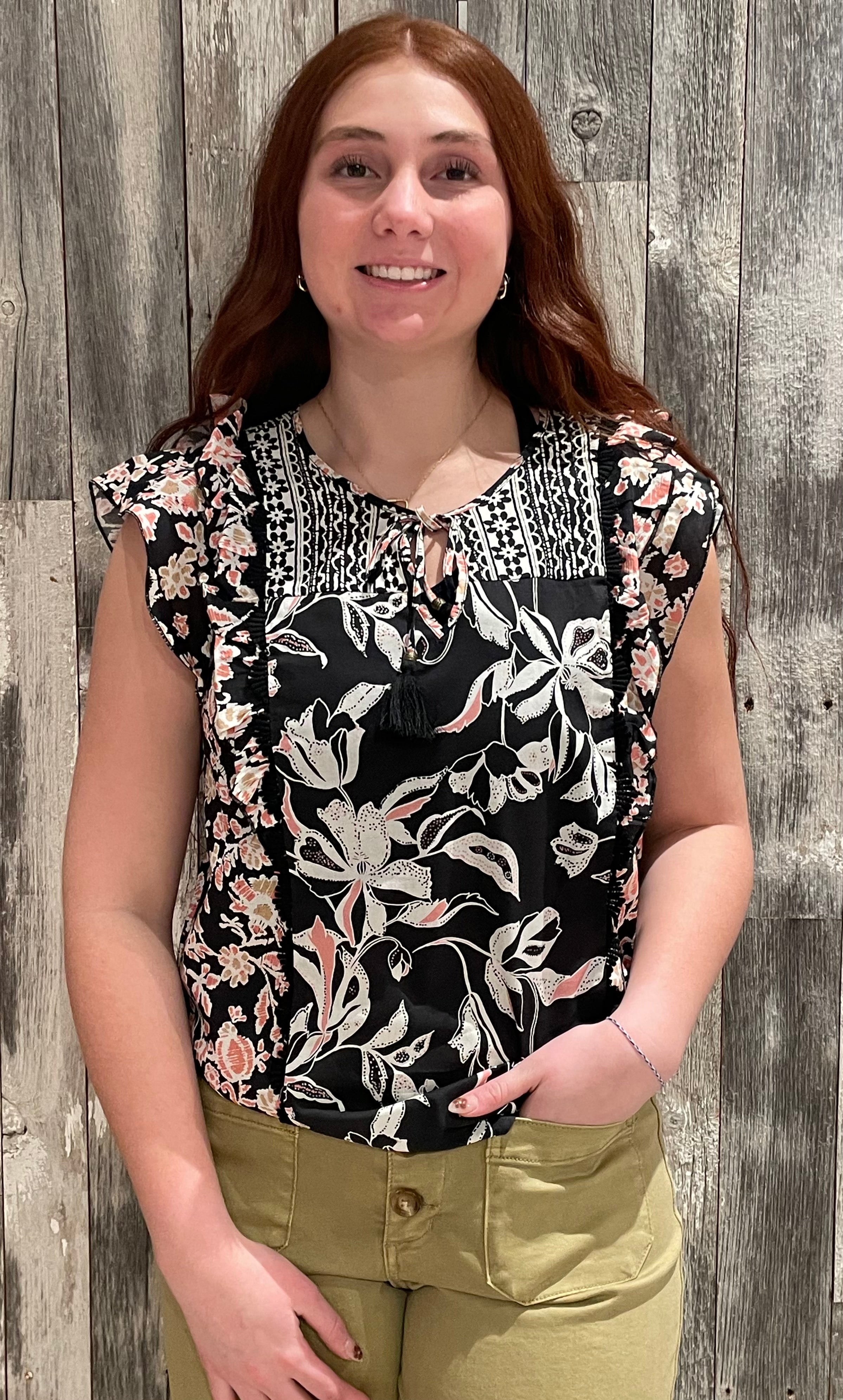 This floral blouse combines feminine charm with intricate detailing. Featuring a delicate floral print in soft, romantic hues, it is accented by ruffled sleeves and a textured yoke with embroidered patterns. The tie-front neckline adds a playful touch, while the lightweight fabric ensures comfort and breathability. Perfect for pairing with jeans or skirts, this blouse is a versatile choice for casual outings or dressed-up occasions.