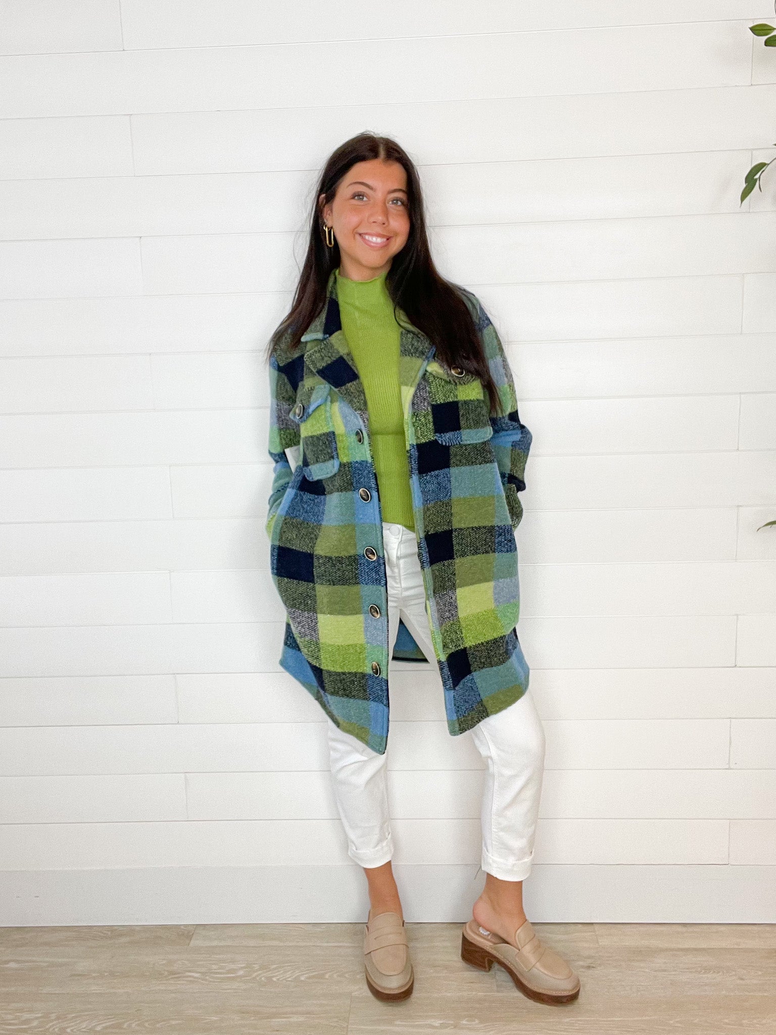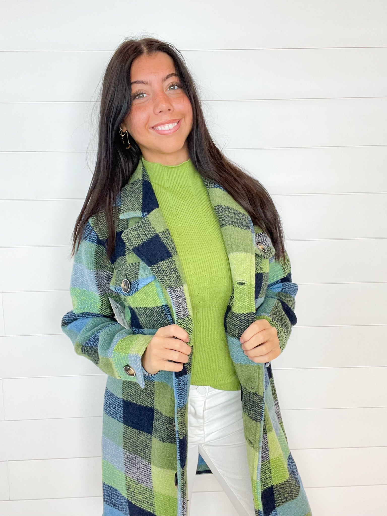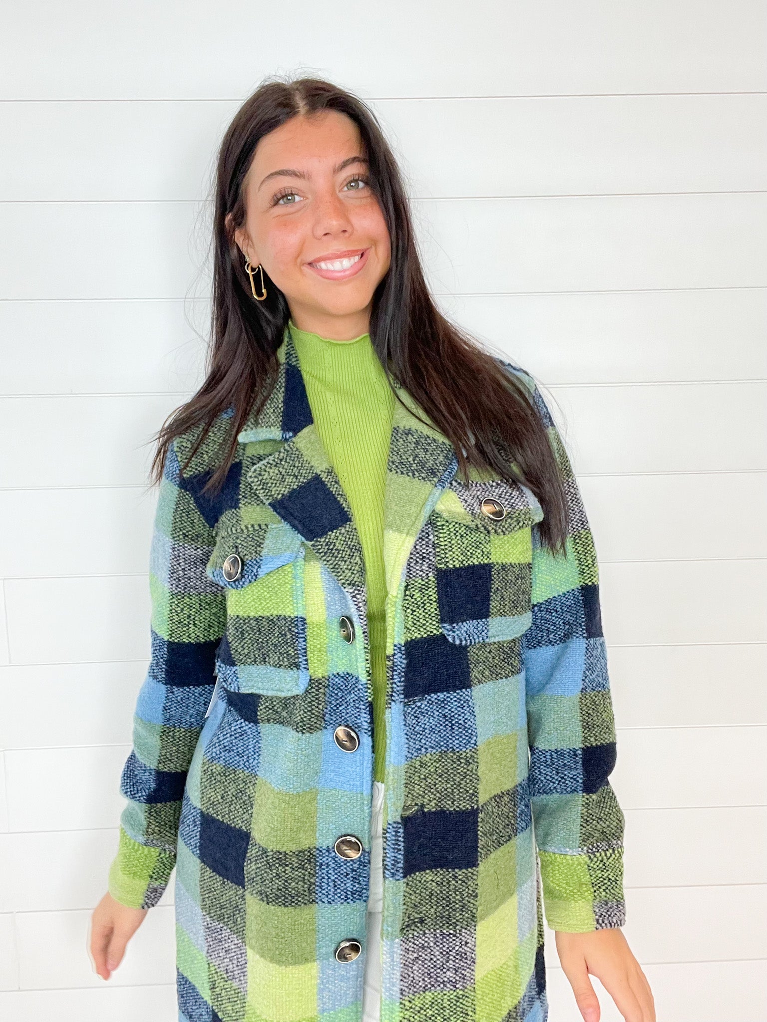 Transform your look with this classic knit shacket, featuring a bold plaid pattern and distinctive novelty buttons. The long silhouette offers ample coverage, keeping you cozy as the weather cools, while the notched lapels add a touch of refined detail, effortlessly enhancing your ensemble with understated elegance