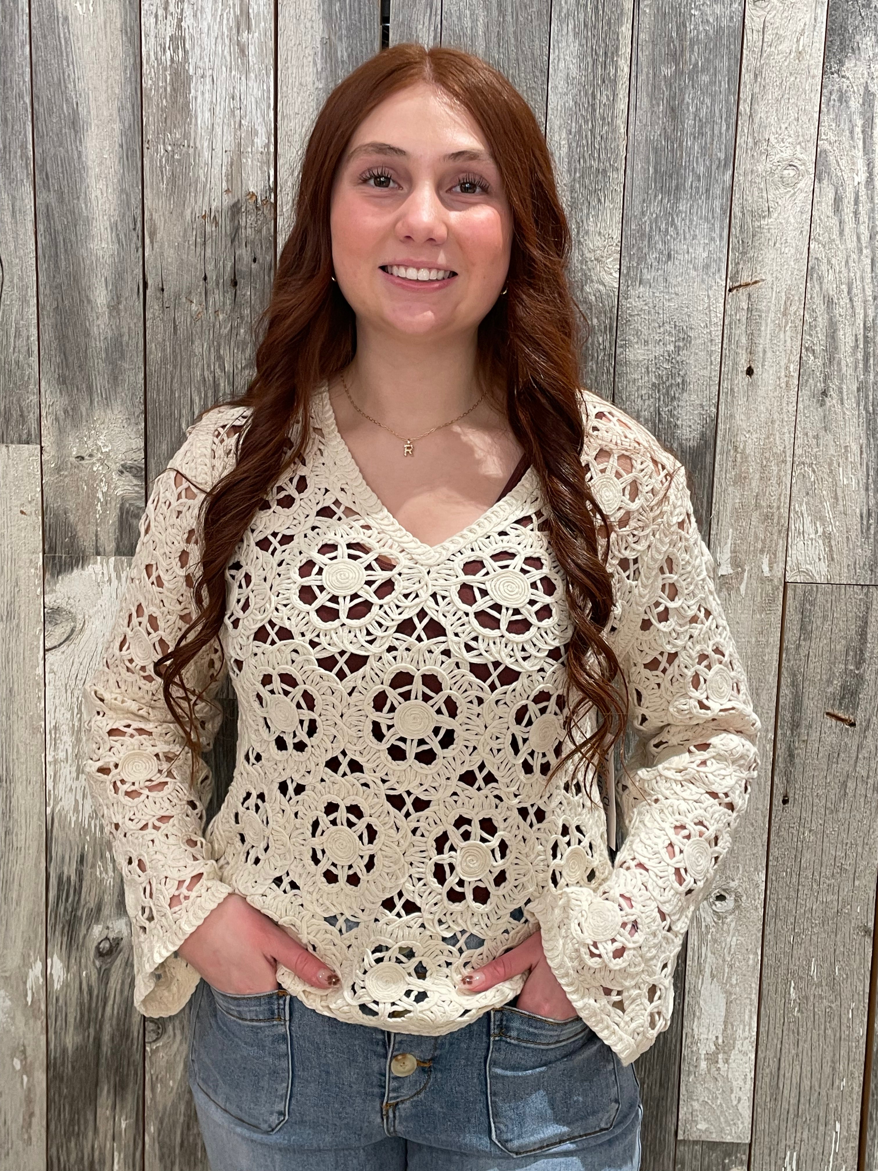 The Open Fancy Crochet V-Neck Bell Sleeve Sweater adds a boho-chic touch to any outfit with its intricate details.