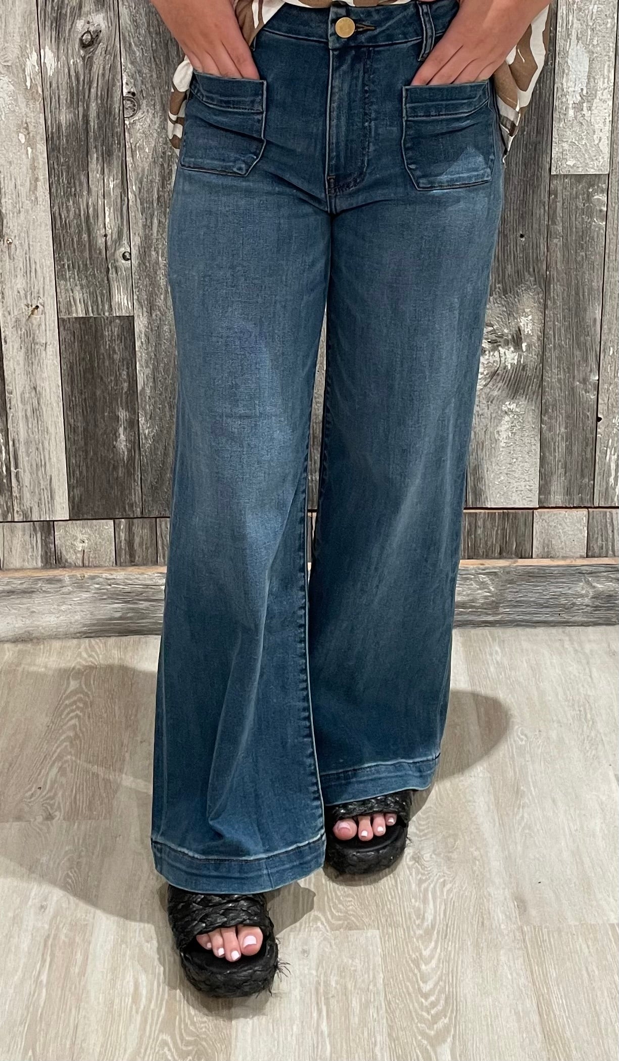 - These pants feature a flattering high rise and bold, dramatic wide legs that give them a striking, retro style. The addition of patch pockets adds both functionality and flair. Perfect for making a fashion-forward statement with vintage-inspired charm.