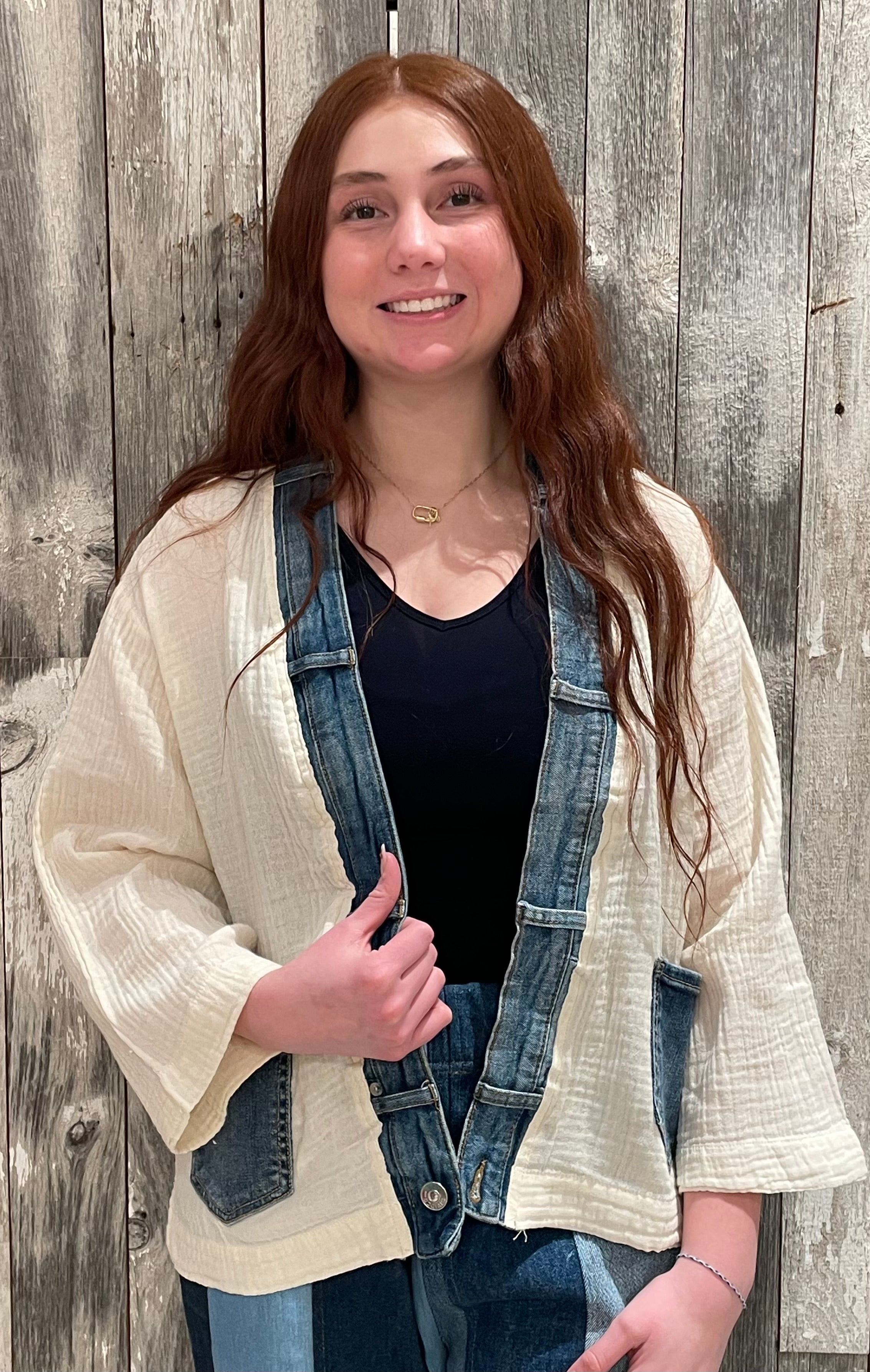 The Melaney Mixed Media Cardigan combines soft cotton gauze with upcycled denim for a unique and eco-conscious design. Its lightweight, breathable fabric and artisanal detailing make it perfect for layering over casual or dressy outfits. This cardigan is a versatile addition to any sustainable wardrobe.