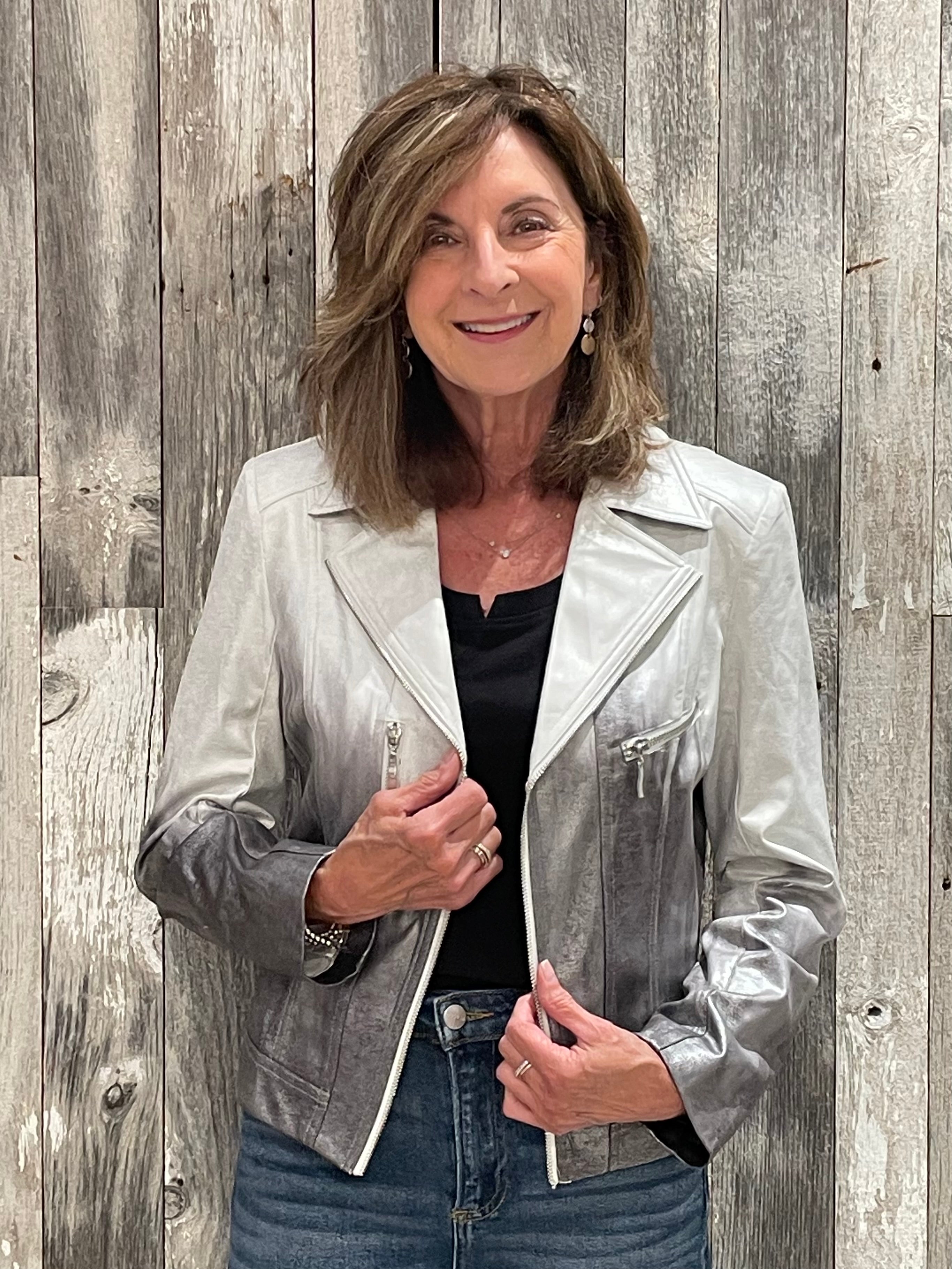 The Metallic Vegan Moto Leather Jacket is a bold statement piece with an edgy vibe.