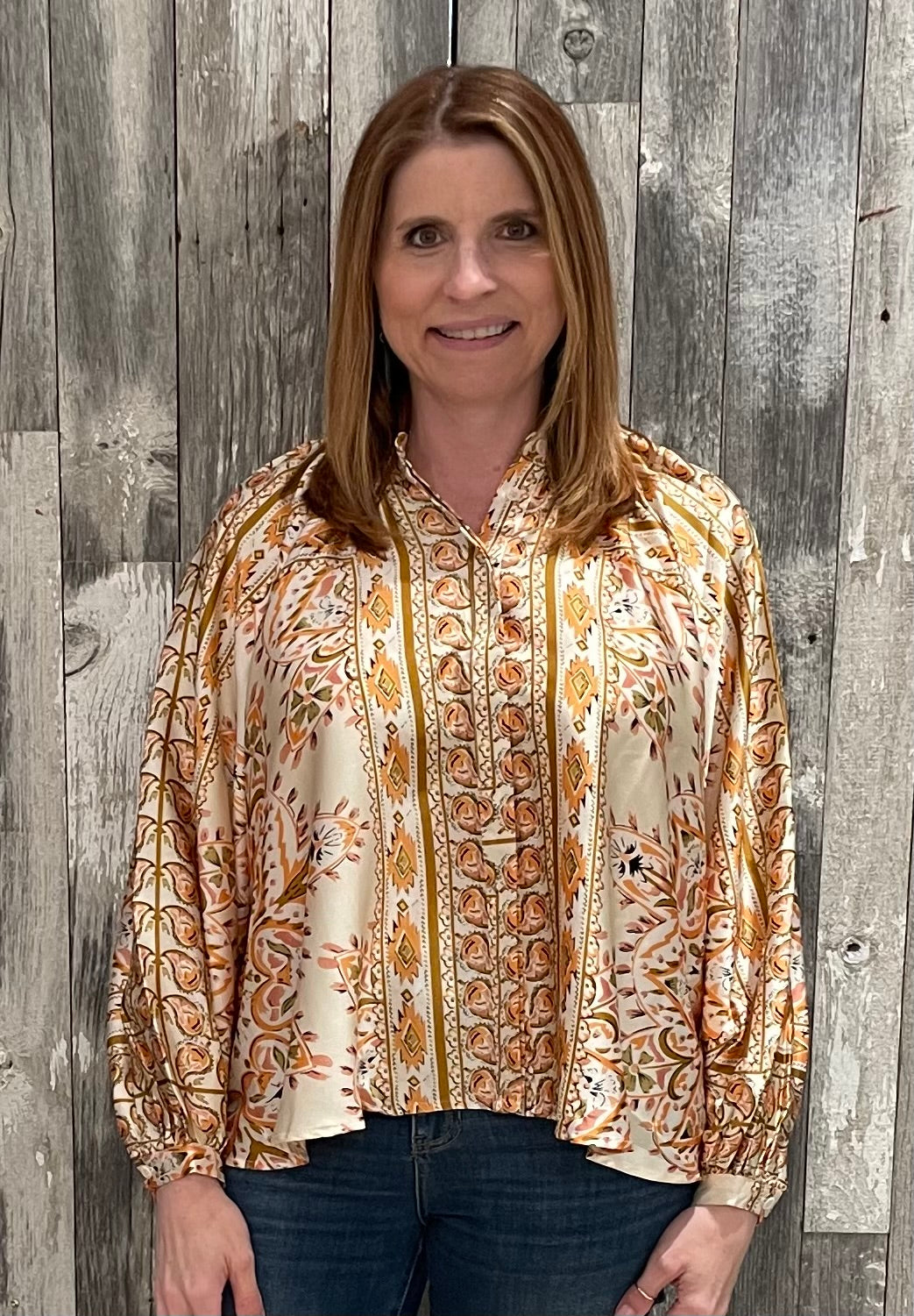 Print: Ornate scarf-inspired pattern featuring gold, peach, white, and tan tones in a symmetrical, baroque-style design