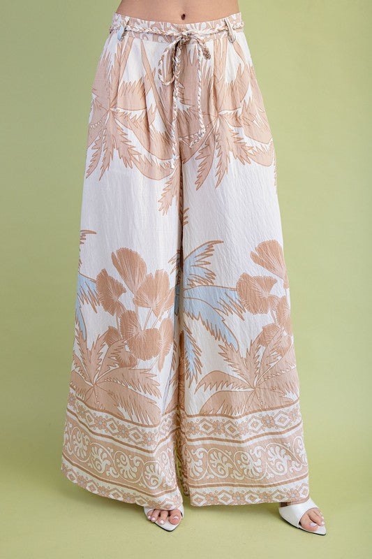 Pattern: Tropical palm and floral print in soft beige and cream tones with hints of light blue