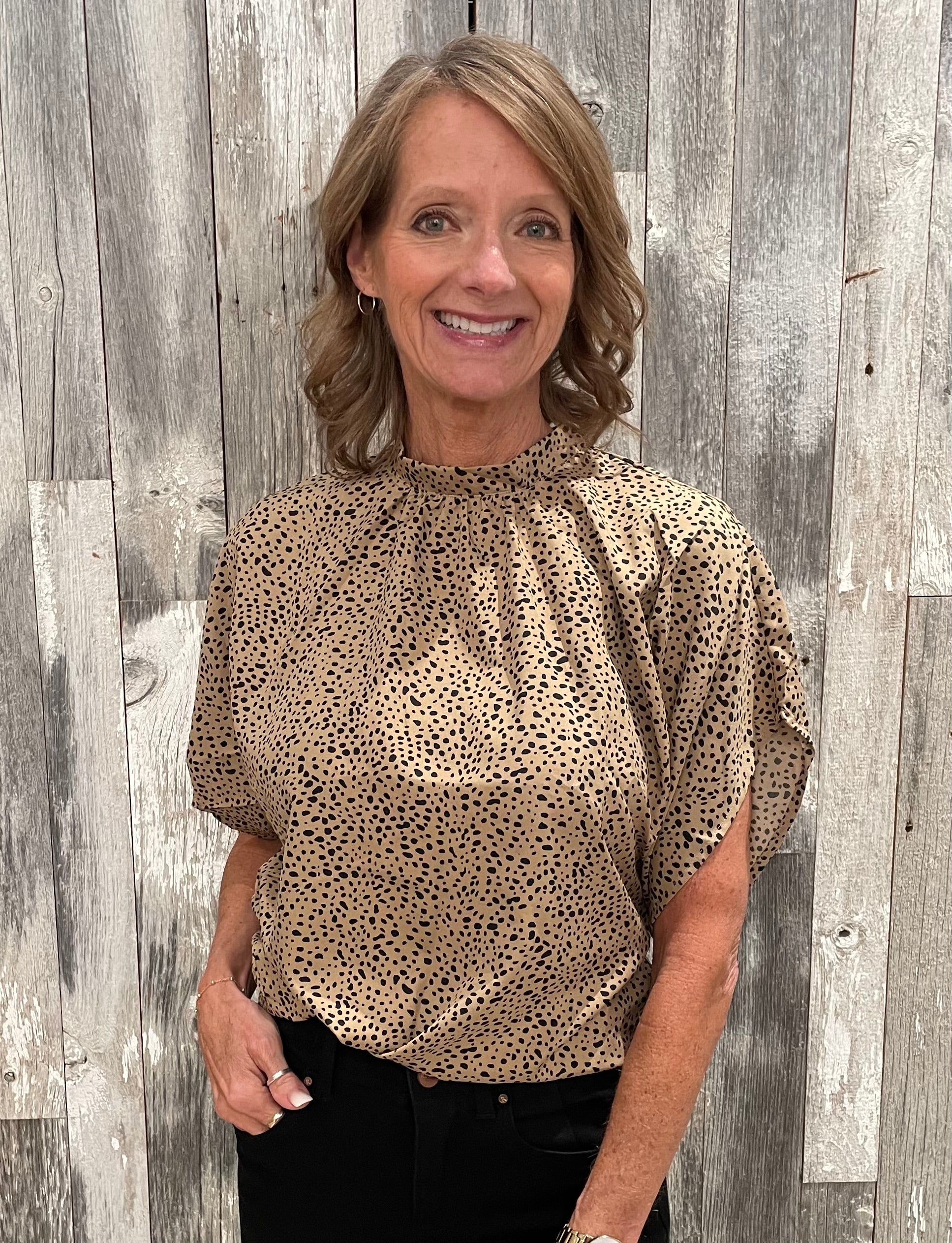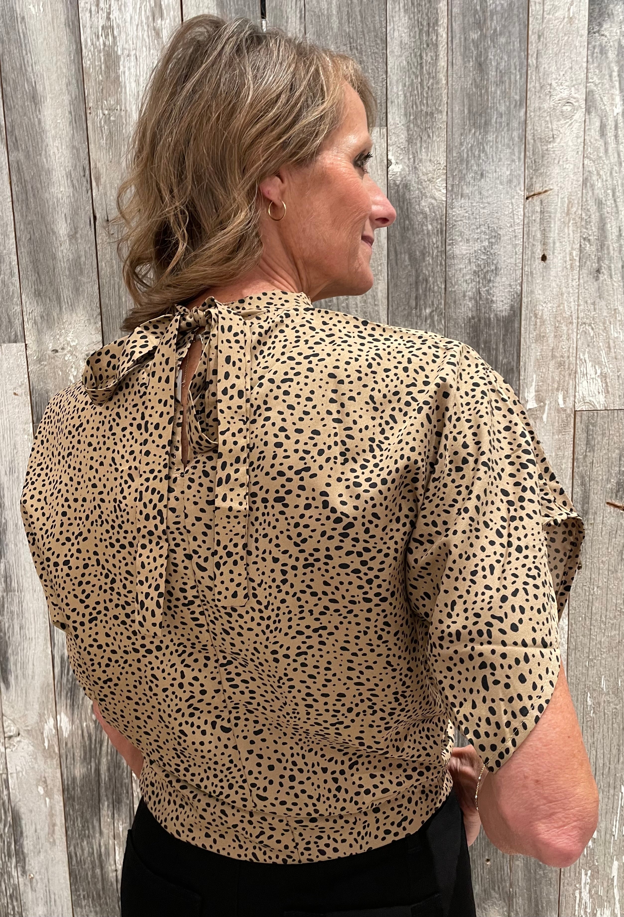 Pattern: Small, irregular black speckles throughout, resembling a mini animal-print or abstract dot pattern.