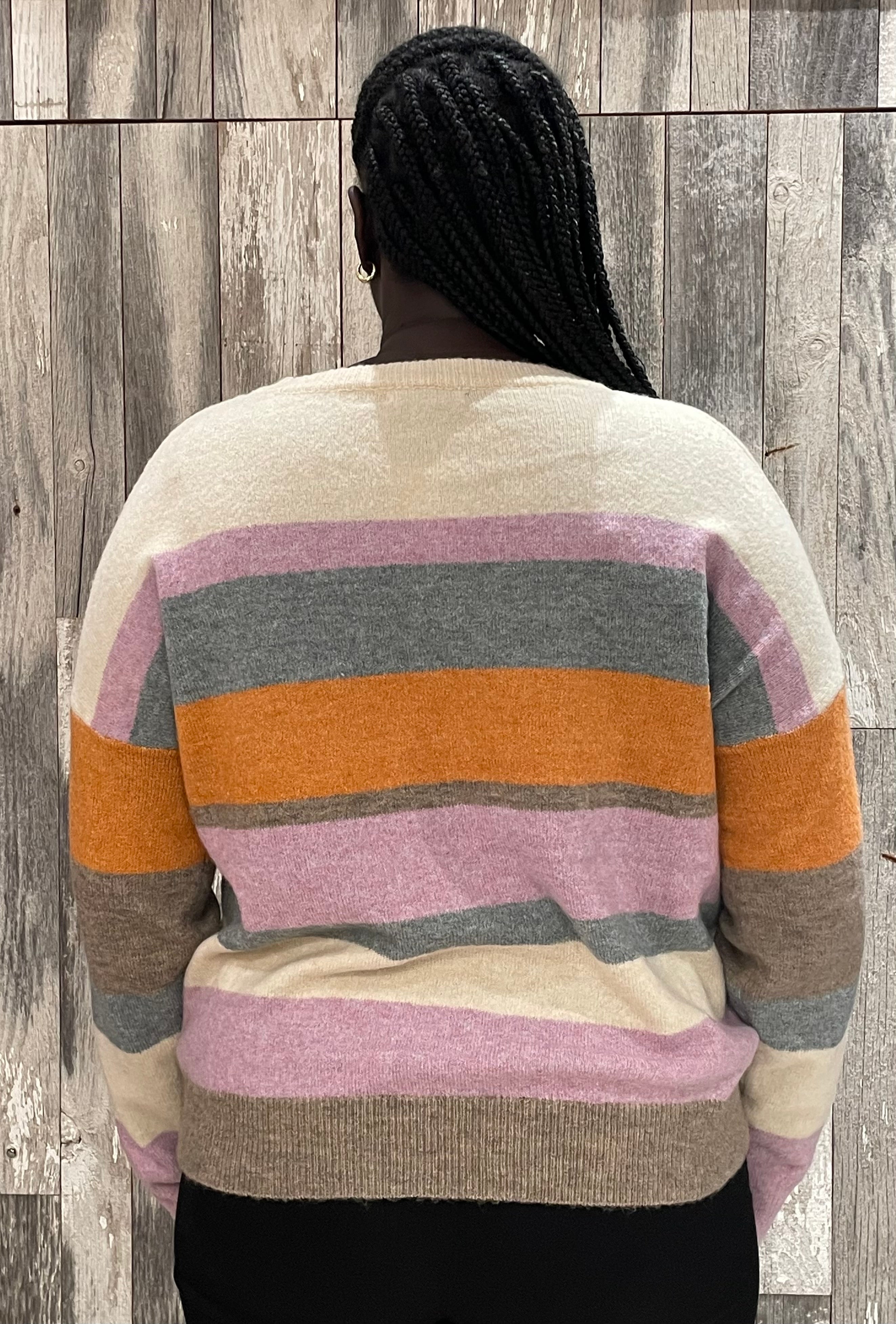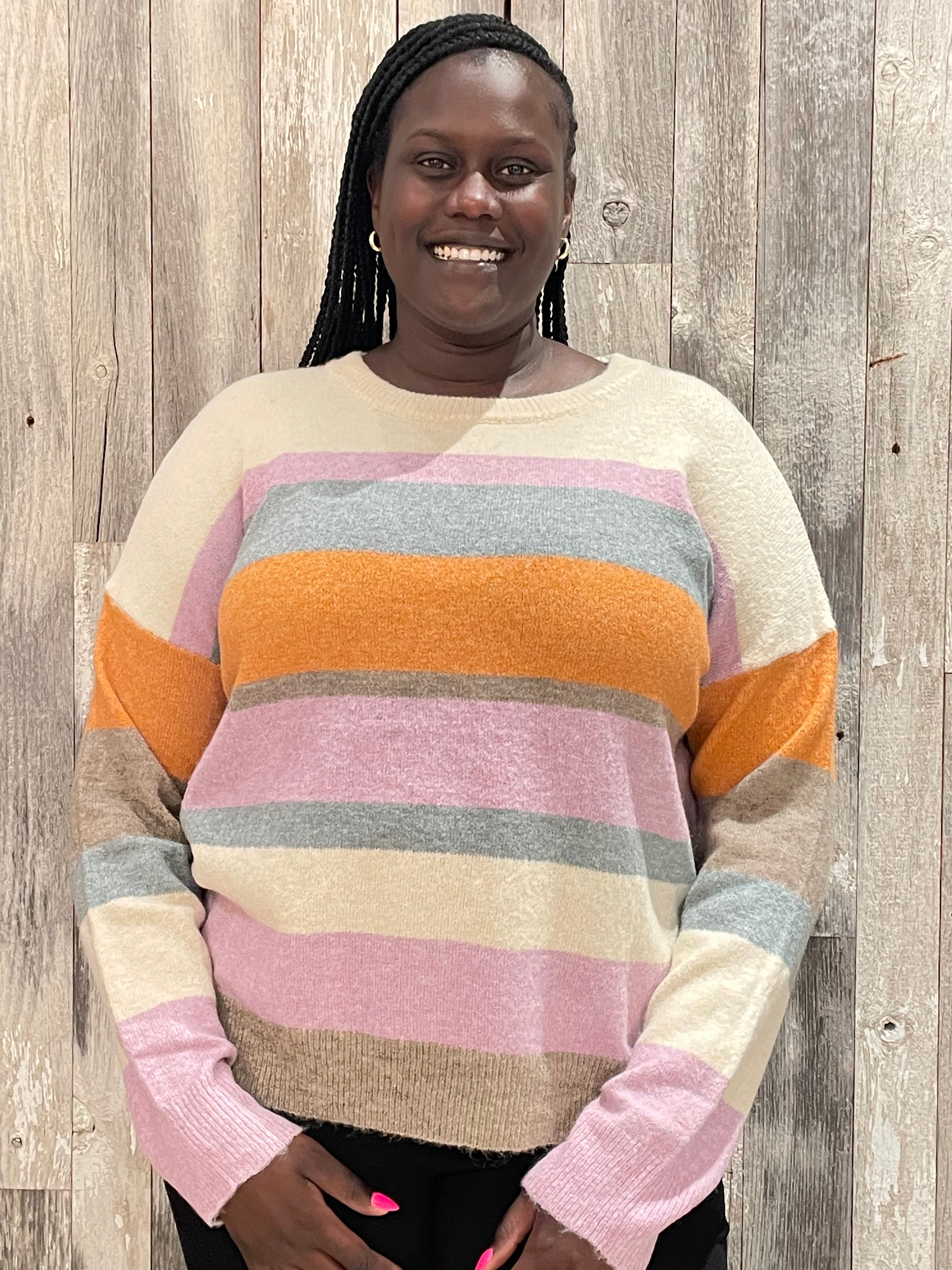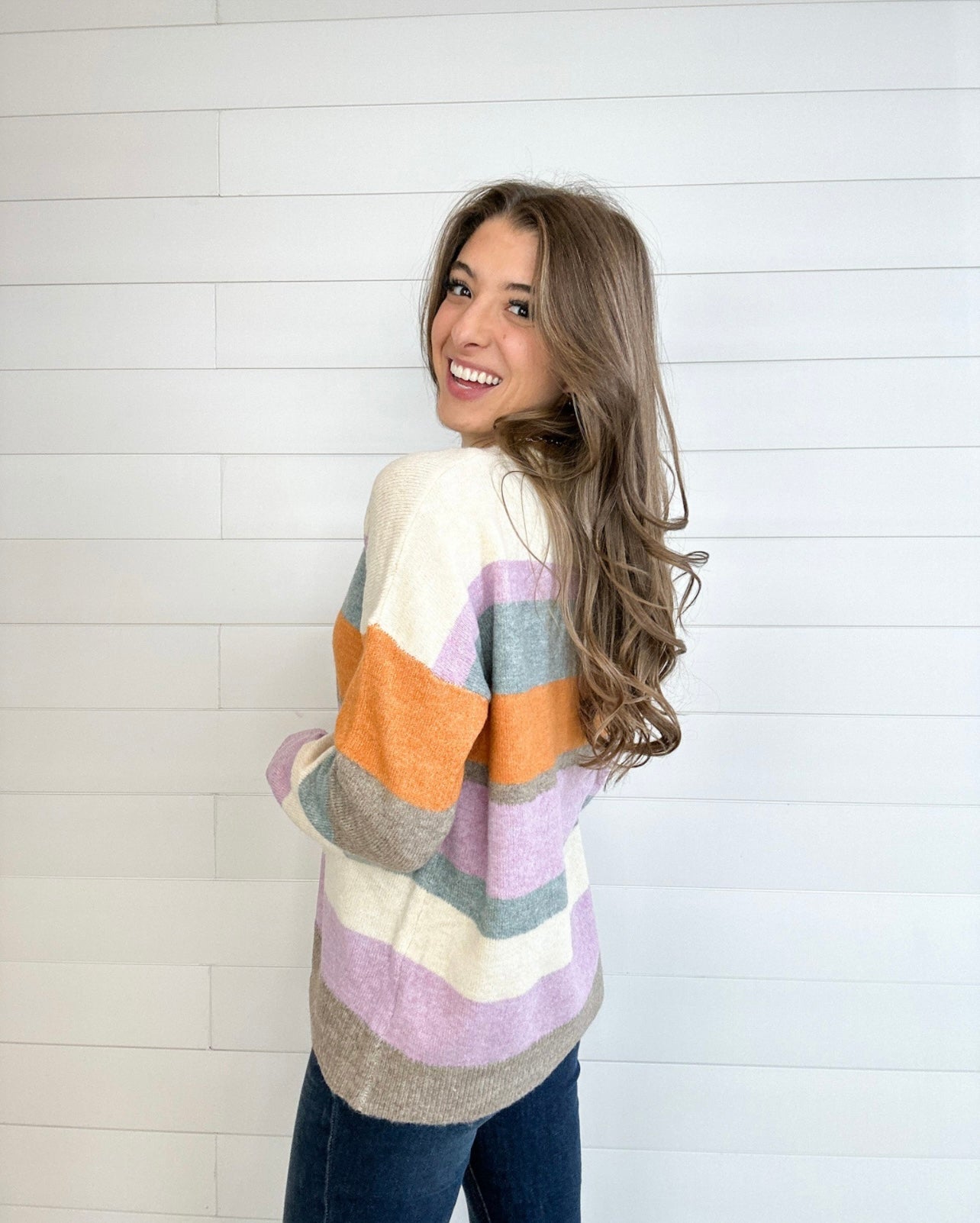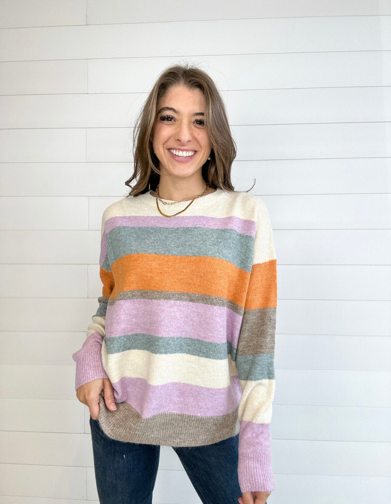 Brighten up your wardrobe with the Multi Stripe Everyday Sweater. Creamy and soft, it features playful stripes in orange, lavender, and steel grey across the chest, adding cheerful color without overwhelming your look. Crafted from a cozy acrylic blend, it’s a versatile sweater you’ll reach for again and again.