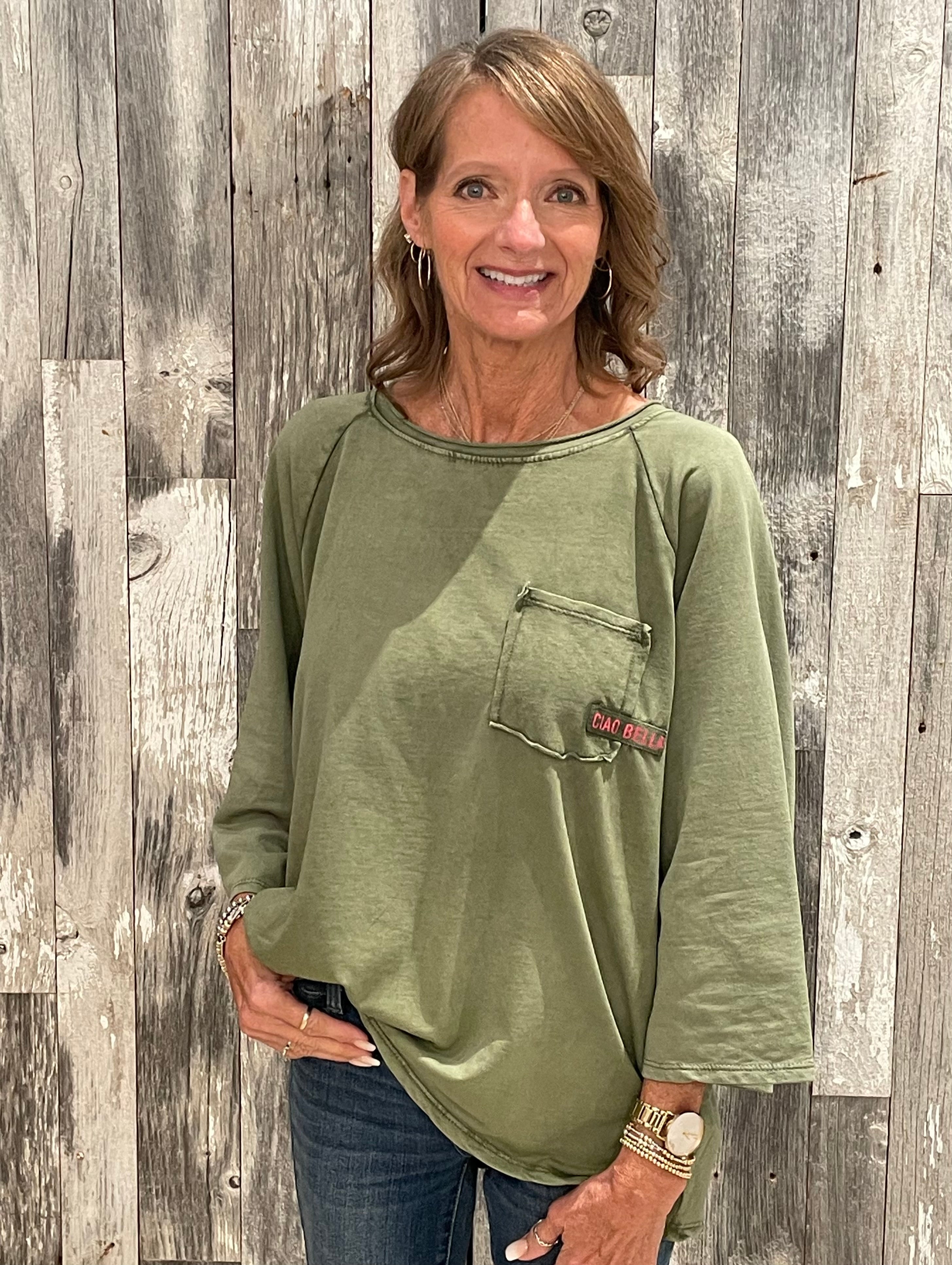 Features embroidered text reading "CIAO BELLA" in a bold font